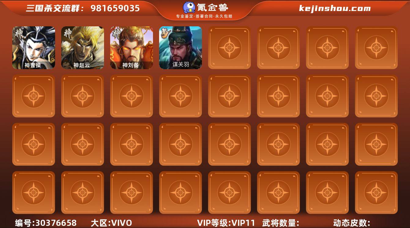 VIP等级: VIP10 官阶: 大将军 武将数量: 389 动态皮肤数量: 42 神将: 神甘宁,神郭嘉,神陆逊,神吕布,神孙策,神赵云,神吕蒙,神周瑜,神诸葛亮 魏国武将: 戏志才,曹纯,陈琳,程昱,嵇康,界曹真,界于禁,界钟会,王元姬,文鸯,杨修,张辽,SP蔡文姬,SP关羽,SP贾诩,SP姜维,SP庞德,卞夫人,蔡贞姬,曹昂,曹操,曹冲,曹洪,曹丕,曹仁,曹叡,贾逵,王异,张恭,鲁芝,界满宠,曹休,界曹植,满宠,荀攸,王基,钟繇,蒯越蒯良,郭嘉,牵招,荀彧,阮慧,杜畿,界郭嘉,崔琰,界曹丕,界荀彧,朱灵,界甄姬,辛毗,吕虔,界陈群,界王异,界许褚,界郭淮,华歆,陈群,界邓艾,界典韦,界曹休,袁涣,李通,乐进,辛宪英,郭淮,毛玠,界曹彰,郭皇后,毌丘俭,夏侯惇,曹植,司马朗,谋于禁,界曹操,许褚,界张辽,谋徐晃,张郃,钟会,文聘,曹彰,界夏侯惇,诸葛诞,司马懿,甄姬,界徐晃,徐晃,孙资刘放,韩浩史涣,曹真,典韦,界夏侯渊,夏侯渊,李典,于禁,王双,邓艾,界司马懿,张春华,孟达-魏,臧霸,牛金,朱灵(国战) 蜀国武将: 董允,花鬘,沙摩柯,张星彩,周群,诸葛瞻,谋马超,谋赵云,马云騄,徐庶,界魏延,杨仪,吕凯,界关羽,界诸葛亮,邓芝,界伊籍,严颜,界黄月英,赵云,张松,彭羕,李丰,界刘备,界刘禅,刘封,糜竺,谋庞统,黄月英,刘巴,关羽,王甫赵累,吴懿,界廖化,向宠,祝融,张飞,黄皓,陈震,魏延,界周仓,谋祝融,马忠,界法正,糜夫人,界孟获,刘禅,界赵云,界姜维,张翼,关银屏,界祝融,SP孙尚香,SP徐庶,卧龙诸葛,周仓,简雍,界关兴张苞,诸葛亮,孙乾,界张飞,界卧龙诸葛,法正,界简雍,赵统赵广,陈到,界马岱,关平,马岱,界庞统,庞统,诸葛果,谋张飞,马谡,马超,廖化,关兴张苞,孟获,秦宓,吴苋,夏侯氏,姜维,黄忠,刘备,界马超,李严,马良,傅肜,蒋琬费祎,刘谌,彭羕(国战),甘夫人 吴国武将: 贺齐,界步练师,界徐盛,留赞,骆统,孙寒华,吴景,周处,文鸯,潘濬,张温,周泰,全琮,吕蒙,诸葛恪,界孙尚香,界顾雍,大乔小乔,界程普,丁奉,谋吕蒙,周...