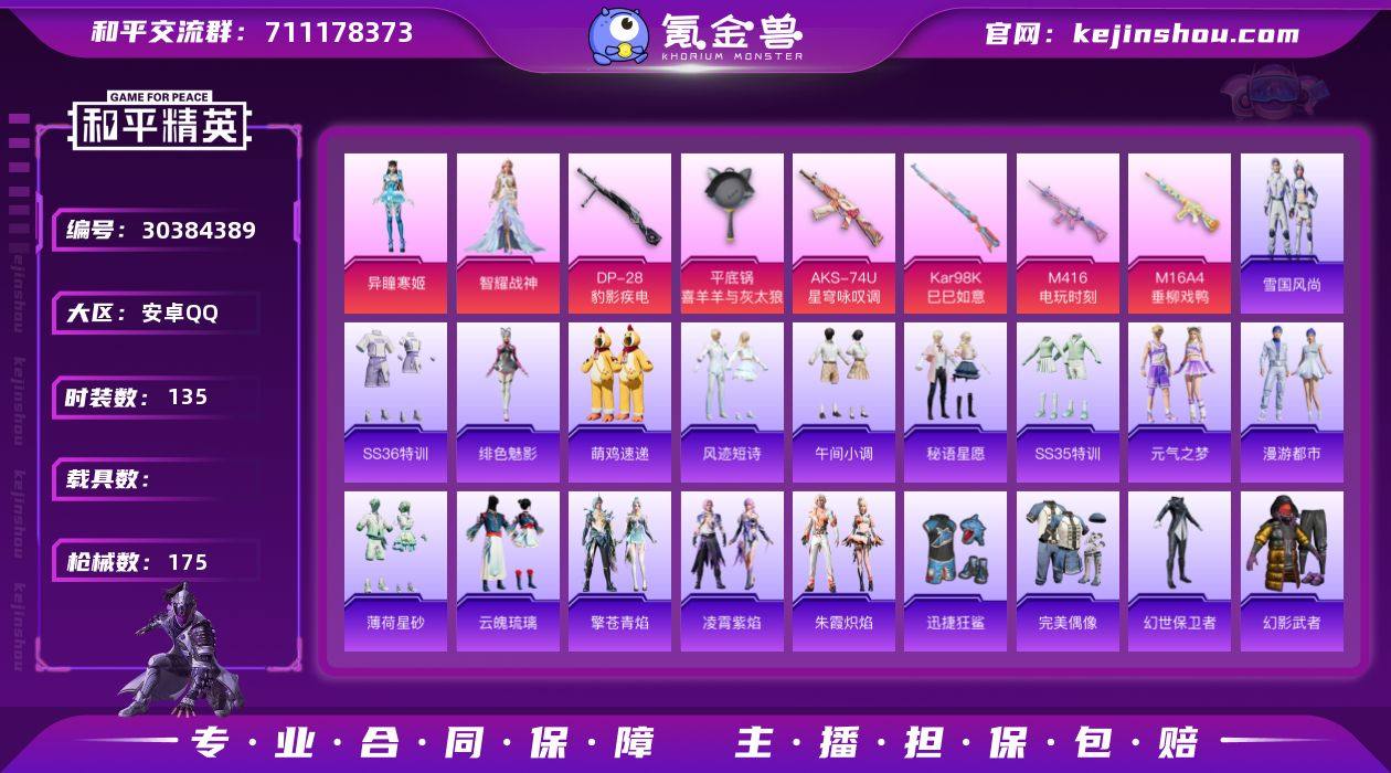 【M16A4-垂柳戏鸭[3级] M416-电玩时刻[5级] 】可改实名 6特效枪 3粉装 135套装 175枪械 Kar98K-已已如意[5级] AKS-74U-星穹咏叹调[5级] 平底锅-喜羊羊与灰太狼[5级] DP-28-豹影疾电[5级] 异瞳寒姬 智耀战神 猪猪侠 雪国风尚 炫彩糖果 -秘语星愿 绯色魅影 风迹短诗 午间小调 王牌印记2 热力值50744 N6773 和平精英买号永久包赔带二次营地ID:906005703