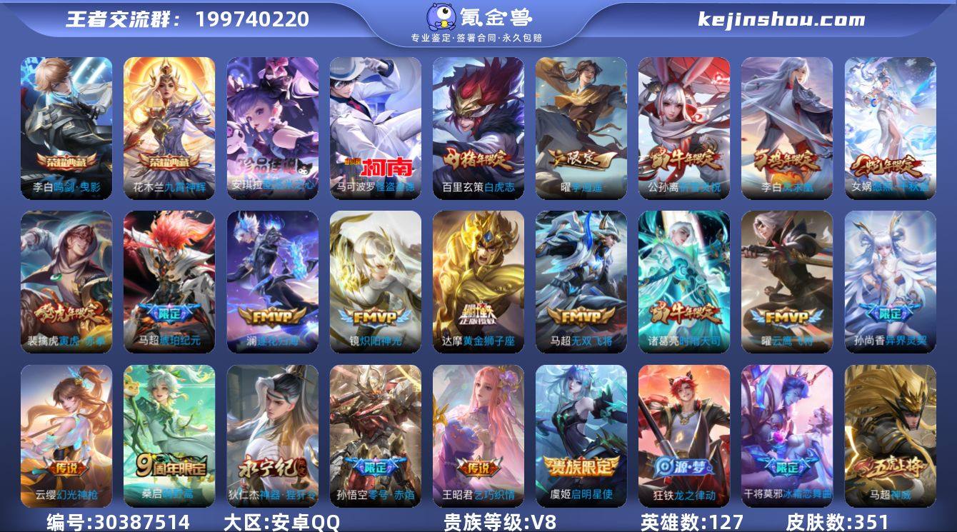 贵族等级:V8 典藏皮肤数:2 珍品无双皮肤数:0 无双皮肤数:0 珍品传说皮肤数:2 传说皮肤数:20 史诗皮肤数:98 皮肤数:351 英雄数:127 段位:星耀 卖家说:超级连体号,王者85段中路,20➕万战,有小魔方,火影准2000w战力(纲手五星)差几十片,满高招,无畏契约,2w库存,全是神中神,王者2k,火影1.7k,瓦900,低价出