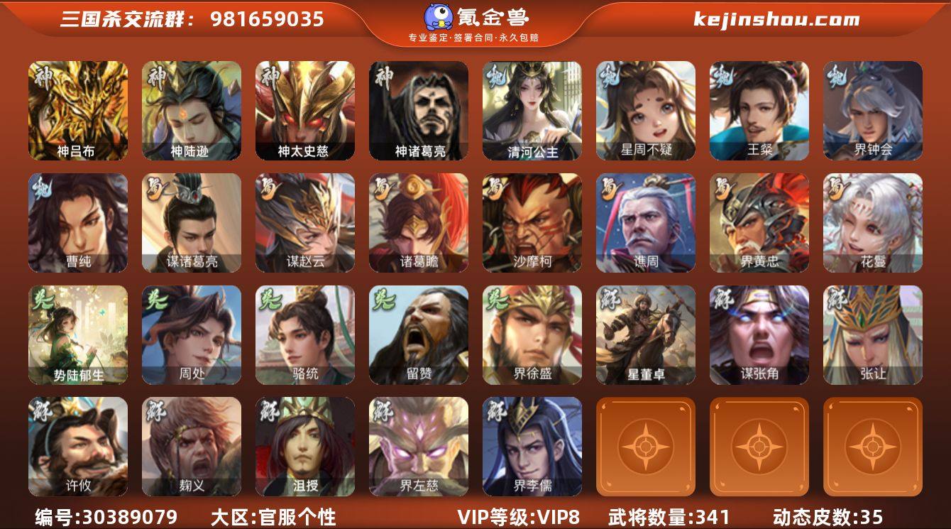 官阶:大将军;VIP等级:VIP8;史诗武将数量:31;动态皮肤数量:35;武将总数:341;史诗宝珠数量:1;将魂数量:1501;神将:5;魏国史诗武将:19;蜀国史诗武将:7;吴国史诗武将:5;群史诗武将:11