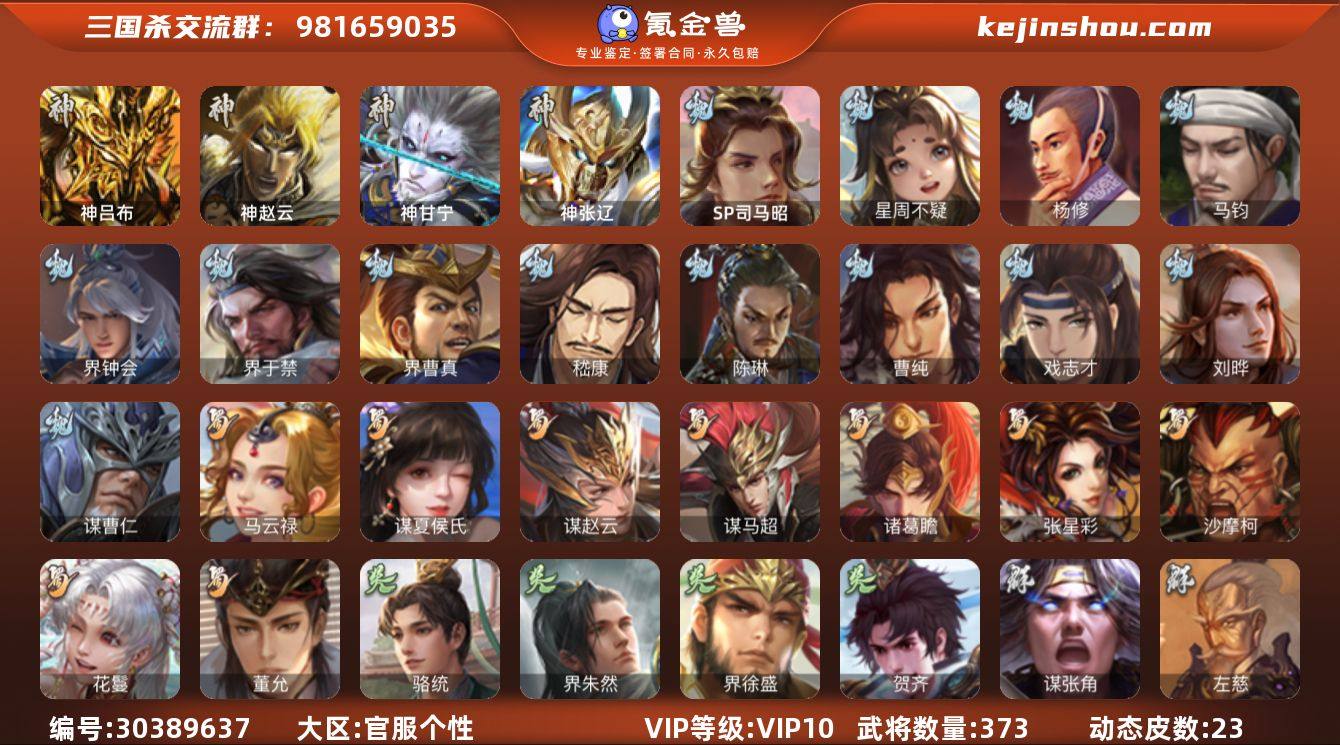 官阶:大将军;VIP等级:VIP10;史诗武将数量:44;动态皮肤数量:23;武将总数:373;史诗宝珠数量:0;将魂数量:1910;神将:6;魏国史诗武将:12;蜀国史诗武将:9;吴国史诗武将:4;群史诗武将:15