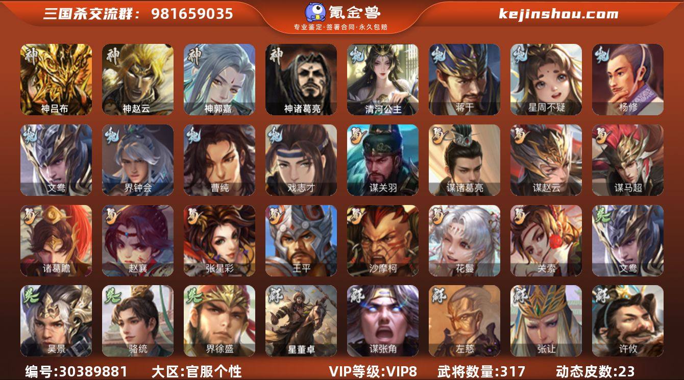 官阶:骠骑将军;VIP等级:VIP8;史诗武将数量:36;动态皮肤数量:23;武将总数:317;史诗宝珠数量:0;将魂数量:2071;神将:4;魏国史诗武将:19;蜀国史诗武将:11;吴国史诗武将:3;群史诗武将:11 神吕布,神赵云,神郭嘉,神诸葛亮,星周不疑,杨修,文鸯,界钟会,曹纯,戏志才,蒋干,清河公主,关索,谋诸葛亮,谋赵云,谋马超,诸葛瞻,赵襄,张星彩,王平,沙摩柯,花鬘,谋关羽,吴景,骆统,界徐盛,左慈,张让,麹义,界左慈,界李儒,卑弥呼,鲍信,谋张角,张绣,许攸,星董卓,神郭嘉-虎年清明(动态),郭嘉-以身证道(动态),星周不疑-才广志宏(动态),钟会-龙年端午(动态),曹丕-气荡山河(动态),甄姬-明珠耀躯(动态),SP蔡文姬-兔年冬日(动态),钟会-谋谟之勋(动态),界钟会-谋谟之勋(动态),曹昂-竭战麟伤(动态),清河公主-魅影萦心(动态),费祎-安民护祚(动态),关索-虎年七夕(动态),诸葛果-蛇年限定(动态),卧龙诸葛-火烧博望(动态),周处-义除三害(动态),吕蒙-剑起惊澜(动态),孙权-永开吴祚(动态),徐盛-破军杀将(动态),麹义-扬刀立威(动态),李儒-鸠杀少帝(动态),界李儒-鸠杀少帝(动态),皇甫嵩-奋钺振旅(动态),左慈-蛇年限定(动态)