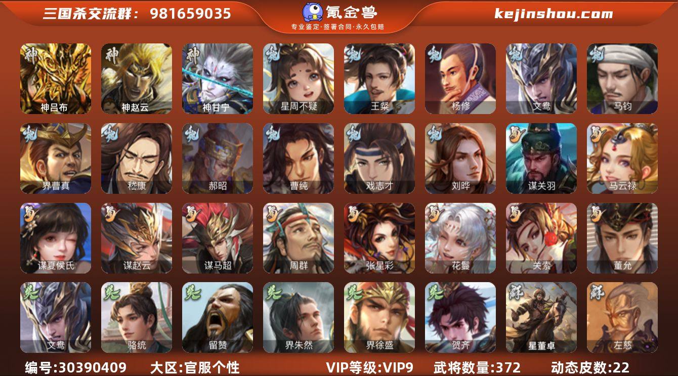 官阶:大将军;VIP等级:VIP9;史诗武将数量:41;动态皮肤数量:22;武将总数:372;史诗宝珠数量:25;将魂数量:5536;神将:5;魏国史诗武将:8;蜀国史诗武将:10;吴国史诗武将:5;群史诗武将:9 神吕布,神赵云,神甘宁,神吕蒙,神周瑜,星周不疑,王粲,杨修,文鸯,魏-司马昭,马钧,界曹真,嵇康,郝昭,曹纯,戏志才,刘晔,关索,马云騄,谋夏侯氏,谋赵云,谋马超,周群,张星彩,花鬘,董允,谋关羽,骆统,留赞,界朱然,界徐盛,贺齐,左慈,郑玄,张让,苏飞,麹义,南华老仙,沮授,许攸,星董卓,神甘宁-万人辟易(动态),钟繇-安民护祚(动态),曹丕-气荡山河(动态),星周不疑-龙年清明(动态),司马昭-昭威淮南(动态),诸葛亮-龙年限定(动态),费祎-安民护祚(动态),关索-依心缱绻(动态),关羽-明良千古(动态),诸葛亮-虎年中秋(动态),诸葛亮-明良千古(动态),诸葛瞻-绵竹之殇(动态),界诸葛亮-明良千古(动态),李丰-太仓聚粟(动态),孙权-兔年中秋(动态),孙权-永开吴祚(动态),徐盛-破军杀将(动态),徐氏-琪花瑶草(动态),刘赞-灵魂歌王(动态),周瑜-蛇年端午(动态),文鸯-势若万钧(动态),许攸-火烧乌巢(动态),苏飞-肝胆相照(动态),星甘宁-肝胆相照(动态)