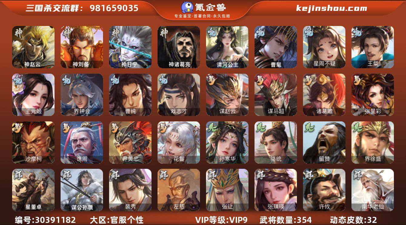 官阶:大将军;VIP等级:VIP9;史诗武将数量:38;动态皮肤数量:32;武将总数:354;史诗宝珠数量:29;将魂数量:12802;神将:7;魏国史诗武将:22;蜀国史诗武将:8;吴国史诗武将:4;群史诗武将:17 神赵云,神刘备,神甘宁,神关羽,神吕蒙,神周瑜,神诸葛亮,曹髦,星周不疑,王粲,王元姬,魏-司马昭,界钟会,曹纯,戏志才,清河公主,谋赵云,谋马超,诸葛瞻,张星彩,沙摩柯,谯周,界黄忠,花鬘,孙寒华,骆统,留赞,界徐盛,谋郭嘉,谋公孙瓒,裴秀,左慈,张让,张琪瑛,南华老仙,沮授,界左慈,界李儒,卑弥呼,鲍信,张绣,李傕,许攸,友徐庶,星董卓,神甘宁-万人辟易(动态),神诸葛亮-孟章诛邪(动态),神赵云-战龙在野(动态),王元姬-婆娑起舞(动态),星周不疑-才广志宏(动态),曹丕-气荡山河(动态),甄姬-明珠耀躯(动态),曹丕-龙年中秋(动态),SP蔡文姬-兔年冬日(动态),邓艾-神兵天降(动态),界邓艾-神兵天降(动态),张春华-雪中舞刃(动态),司马昭-昭威淮南(动态),星徐晃-斧引霹雳(动态),清河公主-魅影萦心(动态),刘备-龙御天下(动态),李丰-太仓聚粟(动态),太史慈-涤荡江东(动态),周处-义除三害(动态),吕蒙-剑起惊澜(动态),孙权-永开吴祚(动态),孙策-虎踞江东(动态),孙寒华-莲华熠熠(动态),徐盛-破军杀将(动态),刘赞-灵魂歌王(动态),周瑜-蛇年端午(动态),貂蝉-忧君难寐(动态),袁绍-声震寰宇(动态),左慈-役使鬼神(动态),许攸-盛气凌人(动态)