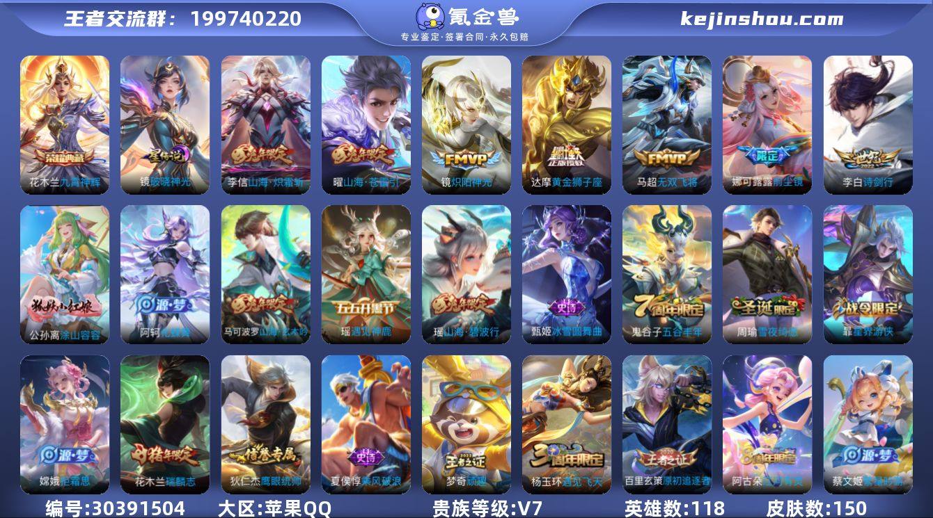 贵族等级:V7 典藏皮肤数:1 珍品无双皮肤数:0 无双皮肤数:0 珍品传说皮肤数:0 传说皮肤数:7 史诗皮肤数:39 皮肤数:150 英雄数:118 段位:非凡王者
