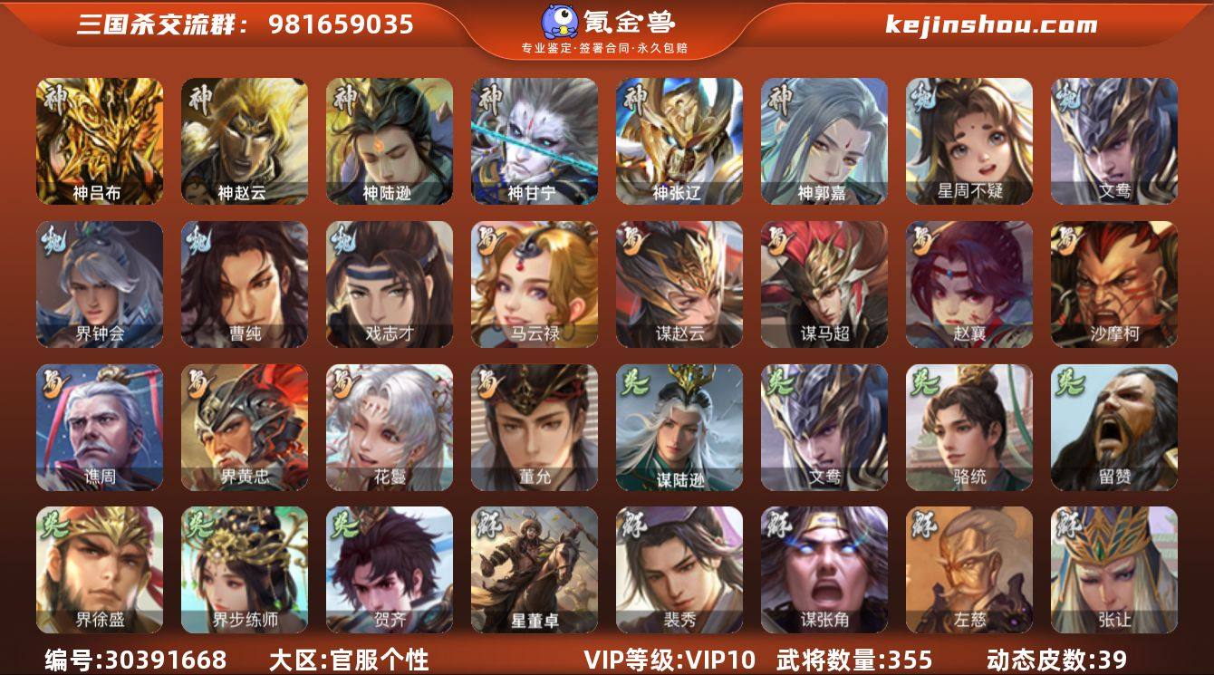 官阶:大将军;VIP等级:VIP10;史诗武将数量:39;动态皮肤数量:39;武将总数:355;史诗宝珠数量:0;将魂数量:6505;神将:8;魏国史诗武将:22;蜀国史诗武将:9;吴国史诗武将:6;群史诗武将:15 神吕布,神赵云,神陆逊,神甘宁,神张辽,神郭嘉,神吕蒙,神周瑜,星周不疑,文鸯,魏-司马昭,界钟会,曹纯,戏志才,马云騄,谋赵云,谋马超,赵襄,沙摩柯,谯周,界黄忠,花鬘,董允,谋陆逊,骆统,留赞,界徐盛,界步练师,贺齐,谋郭嘉,谋黄月英,裴秀,左慈,张让,麹义,沮授,界左慈,界李儒,鲍信,谋张角,许攸,陈珪,友徐庶,星董卓,神郭嘉-虎年清明(动态),神郭嘉-倚星折月(动态),神张辽-散敌擒孙,神甘宁-万人辟易(动态),神赵云-战龙在野(动态),神赵云-神龙天降,星周不疑-才广志宏(动态),曹丕-气荡山河(动态),甄姬-明珠耀躯(动态),SP蔡文姬-兔年冬日(动态),钟会-谋谟之勋(动态),界钟会-谋谟之勋(动态),曹昂-竭战麟伤(动态),戏志才-举棋若定(动态),曹纯-虎年春节(动态),司马昭-昭威淮南(动态),星徐晃-斧引霹雳(动态),诸葛亮-龙年限定(动态),关羽-明良千古(动态),马超-牛年春节(动态),黄月英-鼠年春节(动态),黄月英-木牛流马(动态),界马超-牛年春节(动态),界黄月英-鼠年春节(动态),界黄月英-木牛流马(动态),关银屏-兔年春节(动态),太史慈-涤荡江东(动态),周处-义除三害(动态),陆逊-龙年七夕(动态),孙权-永开吴祚(动态),孙权-吴王六剑(动态),孙尚香-星流霆击(动态),周瑜-鼠年春节(动态),鲁肃-联刘抗曹(动态),界周瑜-鼠年春节(动态),界孙权-吴王六剑(动态),界孙尚香-星流霆击(动态),徐盛-破军杀将(动态),孙鲁育-猪年春节(动态),孙鲁育-牛年端午(动态),刘赞-灵魂歌王(动态),孙寒华-蛇年限定(动态),文鸯-势若万钧(动态),灵雎-霜刃绚练(动态),袁绍-声震寰宇(动态),麹义-扬刀立威(动态),左慈-役使鬼神(动态),许攸-盛气凌人(动态)