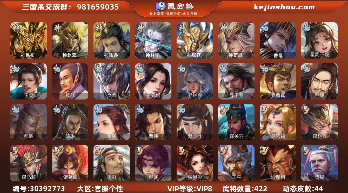 官阶:大将军;VIP等级:VIP8;史诗武将数量:60;动态皮肤数量:44;武将总数:422;史诗宝珠数量:10;将魂数量:11421;神将:8;魏国史诗武将:26;蜀国史诗武将:14;吴国史诗武将:10;群史诗武将:14 神吕布,神赵云,神陆逊,神甘宁,神张辽,神荀彧,神吕蒙,神周瑜,曹髦,星周不疑,王粲,杨修,文鸯,王元姬,界钟会,界于禁,界曹真,嵇康,郝昭,陈琳,曹婴,曹纯,戏志才,马云騄,谋赵云,谋马超,诸葛瞻,周群,赵襄,张星彩,王平,沙摩柯,谯周,界黄忠,花鬘,董允,谋关羽,周处,吴景,孙寒华,骆统,留赞,界朱然,界徐盛,界步练师,贺齐,势陆郁生,左慈,张仲景,张让,苏飞,审配,麹义,界左慈,界李儒,公孙康,卑弥呼,谋张角,李傕,许攸,星董卓,神甘宁-万人辟易(动态),神赵云-神龙天降,张昌蒲-龙年端午(动态),曹丕-气荡山河(动态),甄姬-明珠耀躯(动态),SP蔡文姬-兔年冬日(动态),荀彧-驱虎吞狼(动态),钟会-谋谟之勋(动态),界钟会-谋谟之勋(动态),曹昂-竭战麟伤(动态),戏志才-举棋若定(动态),曹婴-兔年春节(动态),曹纯-虎年春节(动态),王元姬-鼠年冬至(动态),星徐晃-斧引霹雳(动态),刘备-龙御天下(动态),诸葛亮-龙年限定(动态),刘备-明良千古(动态),关羽-啸风从龙(动态),马超-牛年春节(动态),诸葛瞻-绵竹之殇(动态),界刘备-明良千古(动态),界关羽-啸风从龙(动态),界马超-牛年春节(动态),关银屏-鼠年中秋(动态),李丰-太仓聚粟(动态),诸葛果-蛇年限定(动态),卧龙诸葛-火烧博望(动态),周处-义除三害(动态),吕蒙-剑起惊澜(动态),孙权-永开吴祚(动态),周瑜-兔年七夕(动态),孙策-虎踞江东(动态),孙寒华-威灵尽显(动态),孙尚香-星流霆击(动态),大乔-猪年七夕(动态),界大乔-猪年七夕(动态),界孙尚香-星流霆击(动态),徐盛-破军杀将(动态),孙鲁育-牛年端午(动态),孙寒华-蛇年限定(动态),文鸯-势若万钧(动态),袁绍-声震寰宇(动态),麹义-扬刀立威(动态),吕布-鼠年...