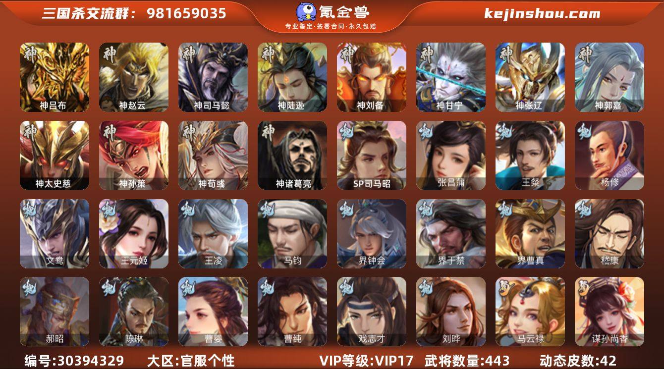 官阶:大将军;VIP等级:VIP17;史诗武将数量:78;动态皮肤数量:42;武将总数:443;史诗宝珠数量:0;将魂数量:1320;神将:14;魏国史诗武将:38;蜀国史诗武将:18;吴国史诗武将:8;群史诗武将:25