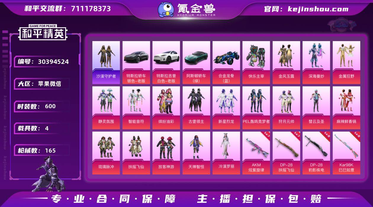 TY528-苹果微信-18粉装-4特效枪-4载具-7粉色飞行器-73104热力值-12王牌印记-155套装-165枪皮 【热门品类】:粉装-缤纷油彩,套装-浪漫天命,套装-沙漠守护者,套装-暗影哥特,套装-浪漫波比,套装-粉红小猪 【粉色套装】:粉装-深海曼妙,粉装-快乐主宰,粉装-金风玉露,粉装-麻辣鲜香锅,粉装-金属狂野,粉装-静灵氛围,粉装-智能音符,粉装-缤纷油彩,粉装-放客神游,粉装-PEL轰鸣竞梦者,粉装-古堡领主,粉装-天禅智恒,粉装-彗云及圣,粉装-狩月元帅,粉装-琉璃脉冲,粉装-新星烈龙,粉装-扶摇飞仙,角色-冷漠罗丽 【粉色枪皮等级】:AKM-炫紫旋律(七级),Kar98K-巳巳如意(五级),DP-28-扶摇飞仙(七级),DP-28-豹影疾电(五级) 【粉色载具】:特斯拉Model 3(冷光银),特斯拉Model X(珍珠白),阿斯顿马丁DBS(绿),合金龙骨(蓝) 【粉色枪皮】:AKM-炫紫旋律,Kar98K-巳巳如意,DP-28-扶摇飞仙,DP-28-豹影疾电 【粉色飞行器】:深海曼妙飞行器,炫紫旋律飞行器,PEL轰鸣竞梦者飞行器,神秘黑猫飞行器,古堡领主飞行器,扶摇飞仙飞行器 【粉色降落伞】:深海曼妙降落伞,快乐主宰降落伞,春暖花开降落伞,天启纪元降落伞,金风玉露降落伞,龙虾霸霸降落伞,炫紫旋律降落伞,PEL轰鸣竞梦者降落伞,神秘黑猫降落伞,古堡领主降落伞,繁花小夜曲降落伞,扶摇飞仙降落伞,月影灵韵降落伞,星穹咏叹调降落伞,异瞳寒姬降落伞,炫彩糖果降落伞 【稀有套装】:套装-巳巳如意,套装-雪国风尚,套装-燕燕于飞,套装-鱼渊荷华,角色-瑰梦爱神,套装-彩虹兔,套装-云朵鹅,套装-雪绒豹,角色-绛羽幽主,套装-朱霞炽焰,套装-凌霄紫焰,角色-紫俏灵猫,套装-炫彩糖果 【营地ID】:478317914
