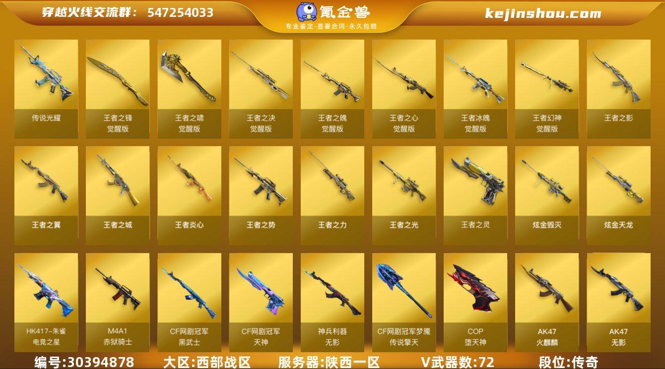 段位:传奇 V武器数:72 王者武器数:15 炫金武器数:6 传说光耀 王者之锋-觉醒版,王者之啸-觉醒版,王者之决-觉醒版,王者之魄-觉醒版,王者之心-觉醒版,王者冰魄-觉醒版,王者幻神-觉醒版,王者之影,王者之翼,王者之城,王者炎心,王者之势,王者之力,王者之光,王者之灵 炫金毁灭,炫金天龙 HK417-朱雀-电竞之星,M4A1-赤狱骑士,黑武士-CF网剧冠军,天神-CF网剧冠军,无影-神兵利器,擎天-CF网剧冠军,COP-堕天神,AK47-火麒麟,AK47-无影,AK47-雷暴,AK47-黑鲨,AK47-黑武士,AK47-麒麟,M4A1-雷神,黑骑士-海王,M4A1-黑骑士,M4A1-黑龙,M4A1-夜魔,M4A1-青龙,M4A1-龙血,M4A1-武圣,M4A1-千变,M4A1-猎神,M4A1-玫瑰精灵,M200-幻神,Barrett-毁灭,Barrett-极光,AWM-天龙,Kar98k-星神,AA-12-雷霆,AK12-天启,AN94-超新星,9A91-烈火,屠龙,龙啸,麒麟刺,擎天,USP-雷暴,斩神刀-雷暴,裁决,天神,破空枪刃-夜魔 王者-零-国色天香,王者-魅影 春,零,凌霄,零·纪元,迷迭香,王者春,炫,雅典娜,职业选手 M4A1-黑骑士音效卡,Barrett-毁灭音效卡,M4A1-雷神音效卡,AK47-火麒麟音效卡