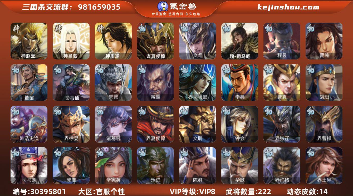 VIP等级: VIP8 官阶: 领军将军 武将数量: 222 动态皮肤数量: 14 神将: 神赵云,神吕蒙,神周瑜 魏国武将: 曹纯,程昱,魏-司马昭,文鸯,张辽,SP关羽,SP贾诩,SP姜维,卞夫人,蔡贞姬,曹昂,曹操,曹冲,曹丕,曹仁,曹叡,王异,鲁芝,界曹植,满宠,荀攸,钟繇,郭嘉,荀彧,杜畿,界郭嘉,崔琰,界曹丕,朱灵,吕虔,界王异,界许褚,华歆,陈群,乐进,辛宪英,郭淮,夏侯惇,曹植,司马朗,界曹操,许褚,界张辽,张郃,钟会,文聘,曹彰,界夏侯惇,诸葛诞,司马懿,甄姬,界徐晃,徐晃,韩浩史涣,胡班,曹真,典韦,夏侯渊,李典,于禁,邓艾,界司马懿,臧霸,朱灵(国战),谋夏侯惇,司马伷,董昭 蜀国武将: 花鬘,谯周,赵襄,徐庶,界关羽,邓芝,界黄月英,界张嶷,赵云,张松,界刘备,界刘禅,刘封,糜竺,谋庞统,黄月英,关羽,吴懿,祝融,张飞,魏延,界周仓,谋祝融,马忠,界法正,刘禅,界赵云,谋诸葛亮,关银屏,SP孙尚香,卧龙诸葛,周仓,简雍,界关兴张苞,诸葛亮,界张飞,界马岱,关平,马岱,界庞统,庞统,诸葛果,谋张飞,马谡,马超,廖化,关兴张苞,孟获,夏侯氏,姜维,黄忠,刘备,界马超,马良,蒋琬费祎,刘谌,甘夫人,SP甘夫人,势魏延,势陈到 吴国武将: 界徐盛,留赞,文鸯,潘濬,周泰,吕蒙,诸葛恪,界孙尚香,谋周瑜,界全琮,孙茹,顾雍,界朱治,严畯,界孙权,祖茂,界吕蒙,凌操,孙尚香,程普,大乔,韩当,陆逊,诸葛瑾,朱然,太史慈,虞翻,界黄盖,孙鲁班,界周瑜,孙权,界甘宁,界韩当,吴国太,甘宁,界大乔,孙坚,孙鲁育,凌统,步练师,周瑜,小乔,潘璋马忠,黄盖,吕岱,界陆逊,徐盛,张昭张纮,势陆郁生 群国武将: 刘焉,麹义,伏完,华雄,刘琦,袁术,刘繇,界庞德,于吉,吕布,李儒,界貂蝉,公孙瓒,SP赵云,胡车儿,王濬,蔡夫人,界张角,界袁术,陈宫,界华佗,贾诩,庞德,张宝,刘表,谋卢植,张角,卢植,袁绍,华佗,貂蝉,伏皇后,界吕布,严白虎,公孙渊,颜良文丑,张任,谋高顺,邹氏,群-司马昭,马腾,纪灵,田丰,友庞统