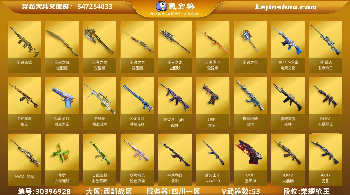 段位:荣耀枪王 VIP等级:VIP6 V武器数:53 王者武器数:7 王者玄武,王者之锋-觉醒版,王者之啸-觉醒版,王者之力-觉醒版,王者之击-觉醒版,王者炎心-觉醒版,王者之击 Colt1911-胜者为王,魂·裁决-胜者为王,HK417-朱雀-电竞之星,金色蔷薇-狼王,萨维奇-热血派对,XM1014-神猪元帅,SCAR Light-玄豹,USP-冥王,机械迷城-穹宇,死神-雪域霜狐,M4A1-赤狱骑士,AWM-昌龙,修罗-古蛇迷踪,金色蔷薇-古蛇迷踪,玫瑰精灵-粉色浪漫,无影-神兵利器,AK47-B-身先士卒,COP-堕天神,AK47-火麒麟,AK47-无影,AK47-黑鲨,M4A1-雷神,黑骑士-海王,M4A1-黑骑士,M4A1-龙血,M4A1-千变,白虎-电玩蓝兔,M200-幻神,Barrett-毁灭,Barrett-极光,AWM-天龙,Kar98k-星神,AA-12-雷霆,AK12-天启,9A91-烈火,屠龙,龙啸,AK47-B-常胜将军,幻灵之锋,AK47-B-战士,AK47-B-战神,AK-47-猩红传说,裁决,天神,破空枪刃-夜魔,雷神-荣耀世冠,火麒麟-荣耀世冠,烈火-动感闪耀,天神-动感闪耀,屠龙-动感闪耀,Barrett-碧霄极光 王者-零-传说之路,王者晴雅 关小雨,零·纪元,魅影,王者春,炫,樱-缤纷夏日,雅典娜,战地猎狐 死神-雪域霜狐-怀旧音效卡,M4A1-黑骑士音效卡,Barrett-毁灭音效卡,M4A1-雷神音效卡 卖家说:爆破生化都有装备,挑战什么枪也有