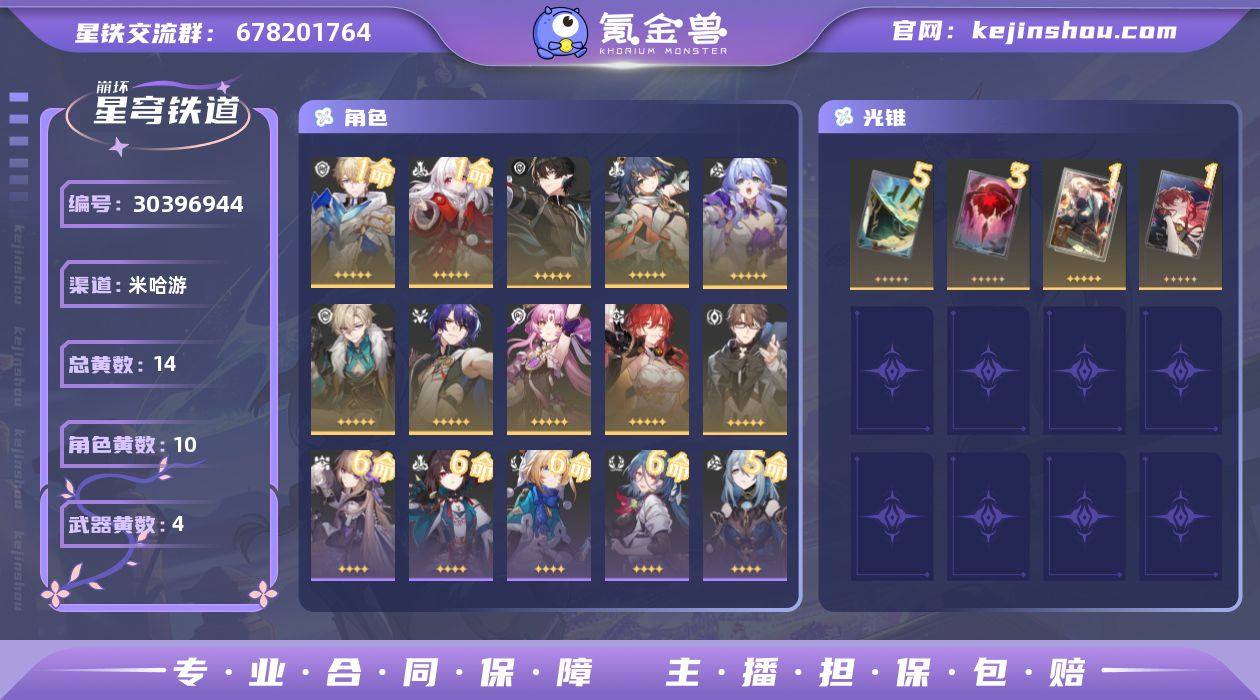 开拓等级:67 开拓者性别:男 总黄数:14 星轨专票:5 五星角色数:10 1命杰帕德,1命克拉拉,0命丹恒·腾荒,0命云璃,0命知更鸟,0命砂金,0命真理医生,0命符玄,0命姬子,0命瓦尔特 五星光锥数:4 5精星海巡航,3精记一位星神的陨落,1精命运从未公平,1精银河铁道之夜 邮箱状态:未绑定 卖家说:还有大量的地图任务几十抽大保底。