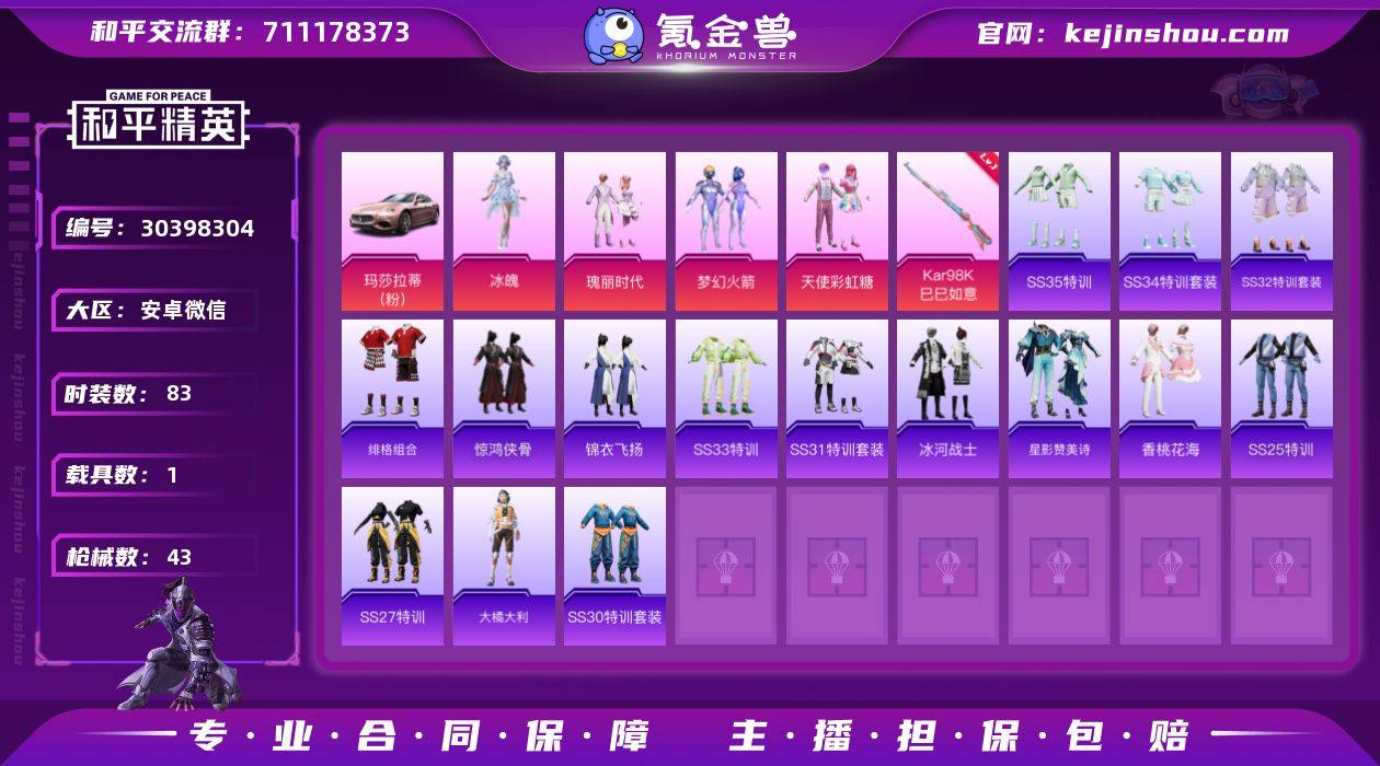 热力值:13694 载具数:1 时装数:83 枪械数:43 战备数:37 游戏等级:54 卓越印记:5 传奇印记:2 绝世印记:1 冰魄,梦幻火箭,瑰丽时代,天使彩虹糖 一级Kar98K-巳巳如意 玛莎拉蒂Ghibli(粉) 炫彩糖果降落伞,炫彩糖果飞行器,梦幻火箭降落伞,甜心宝贝降落伞,未来歌姬降落伞 炫彩糖果,SS35特训,SS34特训套装,冰河战士,大橘大利,绯格组合,惊鸿侠骨,锦衣飞扬,SS25特训,SS27特训,SS30特训套装,SS31特训套装,SS32特训套装,SS33特训套装,香桃花海,星影赞美诗 铝热弹-炫彩糖果,UZI-炫彩糖果,P90-玩趣呆呆,突击盾牌-绝对恒星,AC-VAL-天降萌叽,AKM-龙的传人,AUG-天降萌叽,爆炸猎弓-惊鸿侠骨,DP-28-甜心宝贝,M16A4-冰河战士,M200-惊鸿侠骨,M200-乌木金纹,M249-彩虹符号,M417-惊鸿侠骨,M762-彩虹符号,M762-天降萌叽,M762-甜心宝贝,MG3-幻世战舞者,MG3-惊鸿侠骨,Mini14-梦幻火箭,Mini14-香桃花海,Mk14-冰河战士,平底锅-惊鸿侠骨,QBZ-未来歌姬,撬棍-甜心宝贝,S12K-玩趣呆呆,SCAR-L-炫彩节奏,SCAR-L-夜灯,SKS-未来歌姬,汤姆逊-天降萌叽,VSS-香桃花海 异域银装飞行器,SS35王牌降落伞,惊鸿侠骨降落伞,SS30王牌降落伞,SS33王牌降落伞,SS34王牌降落伞 实名:可二次实名
