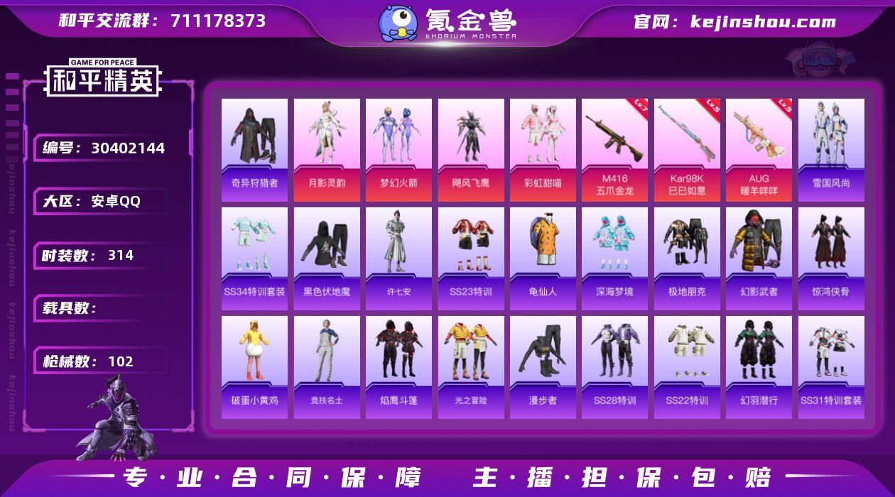 热力值:32293 时装数:314 枪械数:102 战备数:72 游戏等级:52 卓越印记:0 传奇印记:0 绝世印记:0 彩虹甜喵,飓风飞鹰,梦幻火箭,月影灵韵 七级M416-五爪金龙,五级AUG-暖羊咩咩,五级Kar98K-巳巳如意 太空嘟嘟飞行器,碧影闪光降落伞,垂柳戏鸭降落伞,临安公主降落伞,龙珠超降落伞,梦幻火箭降落伞,千面幻镜降落伞,圣堂之誓降落伞,万古烈焰降落伞,旋转彩虹降落伞 雪国风尚,奇异狩猎者,SS34特训套装,冰川特警,冰冻风暴,缤纷果语,缤纷焰火,春光漫游,长空猛禽,蝶变,电音精灵,疯狂小兔子,粉日山川,福星高照,飞行日记,龟仙人,光之冒险,湖蓝色名流,黑色伏地魔,黄色名流,幻世战舞者,幻羽潜行,幻影武者,极地朋克,惊鸿侠骨,娇憨猪猪,竞技名士,酒剑仙,舰行太空,锦衣飞扬,空岛之星,快闪甜心,龙的传人,冷焰舞者,漫步者,梦幻奶油,魅力单车,麻辣教官,萌趣咩咩,霓虹极客,牛气冲天,牛气满满,破蛋小黄鸡,破晓战魂,青涩时光,荣耀,深海梦境,沙漠兵团,神气柴柴,SS18特训,SS20特训,SS21特训,SS22特训,SS23特训,SS24特训,SS25特训,SS26特训,SS27特训,SS28特训,SS29特训,SS30特训套装,SS31特训套装,SS32特训套装,SS33特训套装,探宝勇士,天籁歌者,炫蓝之夏,许七安,旭日情侣,异彩先驱,玉兔迎春,鹰眼刺客,焰鹰斗篷,智谋强哥 MK12-乌木金纹,AUG-紫晶流影,P90-玩趣呆呆,AC-VAL-快闪甜心,AC-VAL-天降萌叽,AKM-彩虹符号,AKM-龙的传人,AKM-奇异狩猎者,AUG-耀粉歌者,AWM-焰鹰斗篷,爆炸猎弓-惊鸿侠骨,DBS-彩虹符号,DBS-焰鹰斗篷,DP-28-彩虹符号,DP-28-焰鹰斗篷,G36C-懵萌河马,GROZA-懵萌河马,GROZA-异彩先驱,GROZA-影袭,Kar98K-影袭,M16A4-幻世战舞者,M200-惊鸿侠骨,M200-乌木金纹,M249-彩虹符号,M24-影袭,M416-蓝色火焰,M417-惊鸿侠骨,M762-天降萌叽,MG3-幻世战舞者,MG3-惊鸿侠骨,蜜獾-垂柳戏鸭,蜜獾-天降萌叽,蜜獾-娇憨猪猪,Mini14-耀粉歌者,Mini14-梦幻火箭,Mini14-异彩先驱,Mk14-暗星紫秘,Mk14-冰河战士,MK20-H-快闪甜心,Mk47-洛神天依,MK47-炫光之旅,MP5K-异彩先驱,莫辛纳甘-懵萌河马,P90-快闪甜心,P90-巳巳如意,平底锅-惊鸿侠骨,平底锅-娇憨猪猪,平底锅-快闪甜心,平底锅-懵萌河马,平底锅-异彩先驱,平底锅-焰鹰斗篷,PKM-懵萌河马,QBZ-洛神天依,撬棍-冷漠罗丽,S12K-垂柳戏鸭,S12K-幻世战舞者,S12K-娇憨猪猪,S12K-破晓战魂,S1897-百万伏特,S1897-炫彩节奏,SCAR-L-红色方程式,SCAR-L-炫彩节奏,SCAR-L-玉兔迎春,SKS-炫彩节奏,SLR-彩虹符号,SLR-金丰海韵,SLR-娇憨猪猪,沙漠之鹰-快闪甜心,SPAS-12-太空嘟嘟,汤姆逊-奇异狩猎者,汤姆逊-天降萌叽,汤姆逊-炫彩节奏,汤姆逊-异彩先驱,UMP45-蓝色火焰,UMP45-生命誓言,UZI-冰河战士,UZI-娇憨猪猪,UZI-影袭,Vector-焰鹰斗篷,VSS-香桃花海 粉色滑翔尾迹,空岛之星尾迹,都市猎人降落伞,惊鸿侠骨降落伞,娇憨猪猪降落伞,快闪甜心降落伞,墨染幽兰降落伞,异彩先驱降落伞,焰鹰斗篷降落伞 实名:可二次实名
