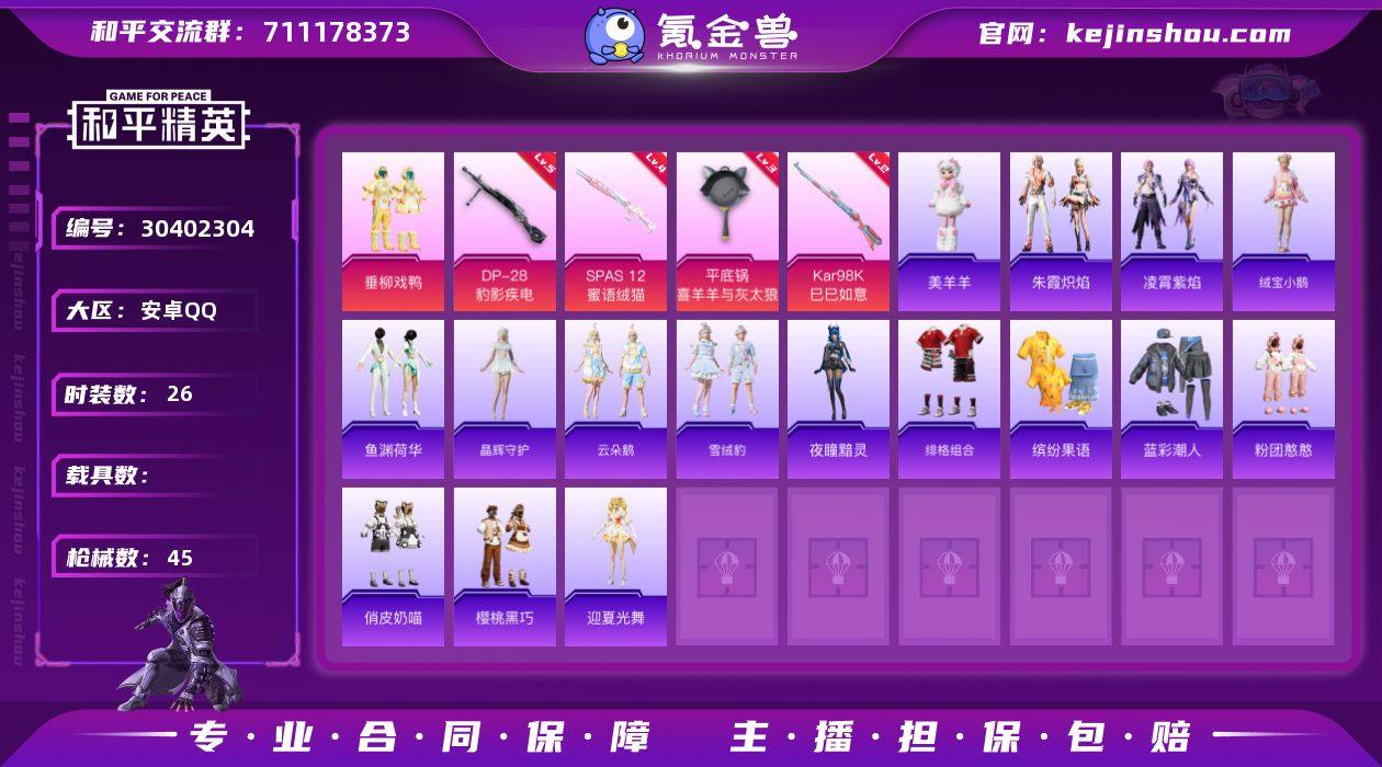 安卓 手Q-1粉装-4特效枪-0载具-0粉色飞行器-12884热力值-1王牌印记-26套装-45枪皮 【粉色套装】:粉装-垂柳戏鸭 【粉色枪皮等级】:Kar98K-巳巳如意(二级),SPAS-12-蜜语绒猫(四级),DP-28-豹影疾电(五级),平底锅-喜羊羊与灰太狼(三级) 【粉色枪皮】:Kar98K-巳巳如意,SPAS-12-蜜语绒猫,DP-28-豹影疾电,平底锅-喜羊羊与灰太狼 【粉色降落伞】:春暖花开降落伞,彩虹甜喵降落伞,蜜语绒猫降落伞,晶梦幻蝶降落伞,荧海星豚降落伞,喜羊羊与灰太狼降落伞,炫彩糖果降落伞 【稀有套装】:套装-绒宝小鹅,套装-鱼渊荷华,套装-晶辉守护,套装-云朵鹅,套装-雪绒豹,角色-夜瞳黯灵,套装-朱霞炽焰,套装-凌霄紫焰,玩偶服-美羊羊 【稀有枪皮】:SCAR-L-炫彩节奏,GROZA-晶梦幻蝶,QBZ-彩虹符号,M762-天降萌叽,M762-彩虹甜喵,M762-云朵鹅,AC-VAL-天降萌叽,ARX-凌霄紫焰,UZI-天降萌叽,UMP45-绒宝小鹅,JS9-凌霄紫焰,P90-巳巳如意,AWM-垂柳戏鸭,Win94-晶梦幻蝶,莫辛纳甘-蜜语绒猫,AMR-喜羊羊与灰太狼,SVD-云朵鹅,SPAS-12-云朵鹅,MG3-幻世战舞者,PKM-蜜语绒猫,MG-36-凌霄紫焰,P92-凌霄紫焰,沙漠之鹰-云朵鹅,爆炸猎弓-喜羊羊与灰太狼,大砍刀-云朵鹅,撬棍-冷漠罗丽,平底锅-凌霄紫焰 【其他套装】:套装-绯格组合,套装-缤纷果语,套装-蓝彩潮人,套装-粉团憨憨,套装-俏皮奶喵,套装-樱桃黑巧,角色-迎夏光舞 【营地ID】:957163223