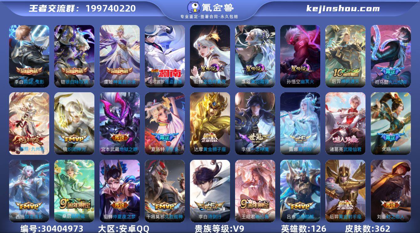 贵族等级:V9 典藏皮肤数:3 珍品无双皮肤数:0 无双皮肤数:0 珍品传说皮肤数:1 传说皮肤数:34 史诗皮肤数:106 皮肤数:362 英雄数:126 段位:钻石 卖家说:34传说 108史诗 1无双(马可怪盗) 3典藏 司马懿全皮