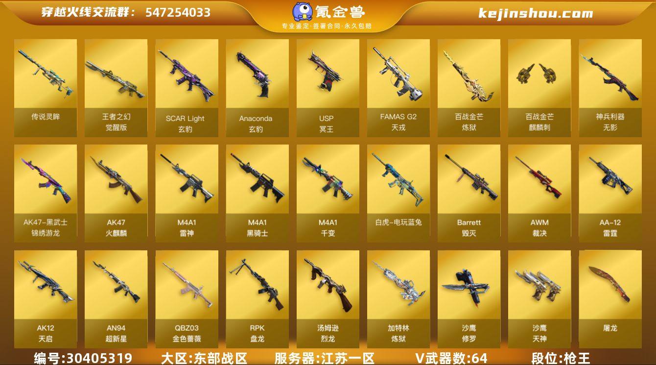 江苏一区-67V-2王者-0炫金 【传说武器】:传说灵眸 【热门武器】:传说灵眸,QBZ03-金色蔷薇,死亡之眼,白虎-电玩蓝兔,M4A1-黑骑士,汤姆逊-烈龙*2,RPK-盘龙*5,加特林-炼狱,沙鹰-修罗*2,金刚伞 【音效卡】:Barrett-毁灭音效卡,AWM-裁决音效卡,QBZ03-天罚音效卡,炼狱-百战金芒-庆典舞曲音效卡 【皮肤】:裁决-运输船 皮肤,雷神-暗月,雷神-航星皮肤,M4A1-再燃火线,火麒麟-心动糖果,毁灭-风暴,毁灭-英雄计划 皮肤,炼狱-末日审判 皮肤,屠龙-星耀 皮肤,屠龙-惊鸿 皮肤,轻型军用手斧-再燃火线 【角色】:机械姬,玄豹,王者葵-惊若翩鸿,北极狐-X,芳心审判者,风暴女,嘉年华灵狐,娟娟,兰妹妹,零-水下丽影,灵狐者-黄金海岸,潘多拉-X,潘多拉-甜心教官,斯沃特-X,铁骑荣耀,新娜塔莎,影武者-X 【人偶武器】:异变清道夫-蛇影双骄,AWM-灵狐-15周年嘉年华,迷你波特博士*5,夺魂,迷你火种*4,迷你生化手雷*2 【暴走生化】:死亡之眼,超级对讲机 【挑战大师】:神圣爆裂者III,冰龙粉碎者-白马银枪,激光毁灭者III,机甲撕裂者III,神圣爆裂者-末日III 【英雄级武器】:M4A1-千变,AK47-火麒麟,M4A1-雷神,M4A1-黑骑士,AK12-天启,AN94-超新星,QBZ03-天罚,无影-神兵利器,黑武士-锦绣游龙,FAMAS G2-天戎,SCAR Light-玄豹,QBZ03-金色蔷薇,王者之幻-觉醒版,白虎-电玩蓝兔,Barrett-毁灭,AWM-裁决,RPK-盘龙*5,加特林-炼狱,炼狱-百战金芒,汤姆逊-烈龙*2,AA-12-雷霆,沙鹰-修罗*2,沙鹰-天神*4,Anaconda-玄豹,USP-冥王,屠龙,麒麟刺-百战金芒,丛林匕首-玄豹*3,王者冰锋-觉醒版,高爆手雷-玄豹*7,闪光弹-玄豹*7,烟雾弹-玄豹*7 【道具】:BS战队炫彩背包,XROCK炫彩背包,机械魔影背包-红色,沙漠龙背包-猛男专属,炫彩背包-诺拉,百战金芒炫彩背包,虎牙炫彩背包,黄金巨石...