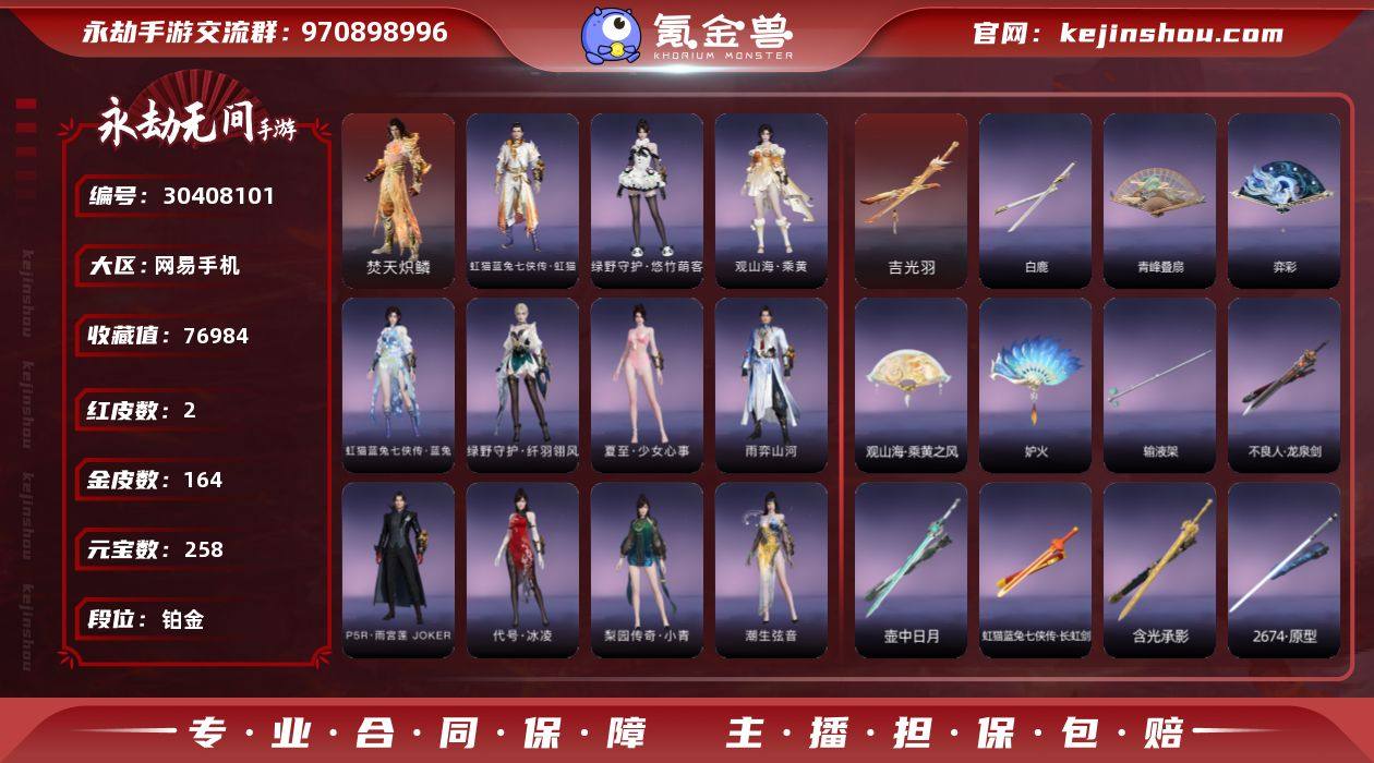 永劫无间官服账号,自用号出掉。每个赛季都玩,现在淡游了所以想转给有缘人。号里大部分英雄和武器都有品质不错的皮肤,具体可以看图。腾讯服务器,支持端游和手游互通,安全靠谱。因为最近在清理闲置游戏账号,这个号用得少了就打算出了。虚拟物品售出不退不换,下单默认成年人,麻烦确认好再拍~有问题可以先问细节~