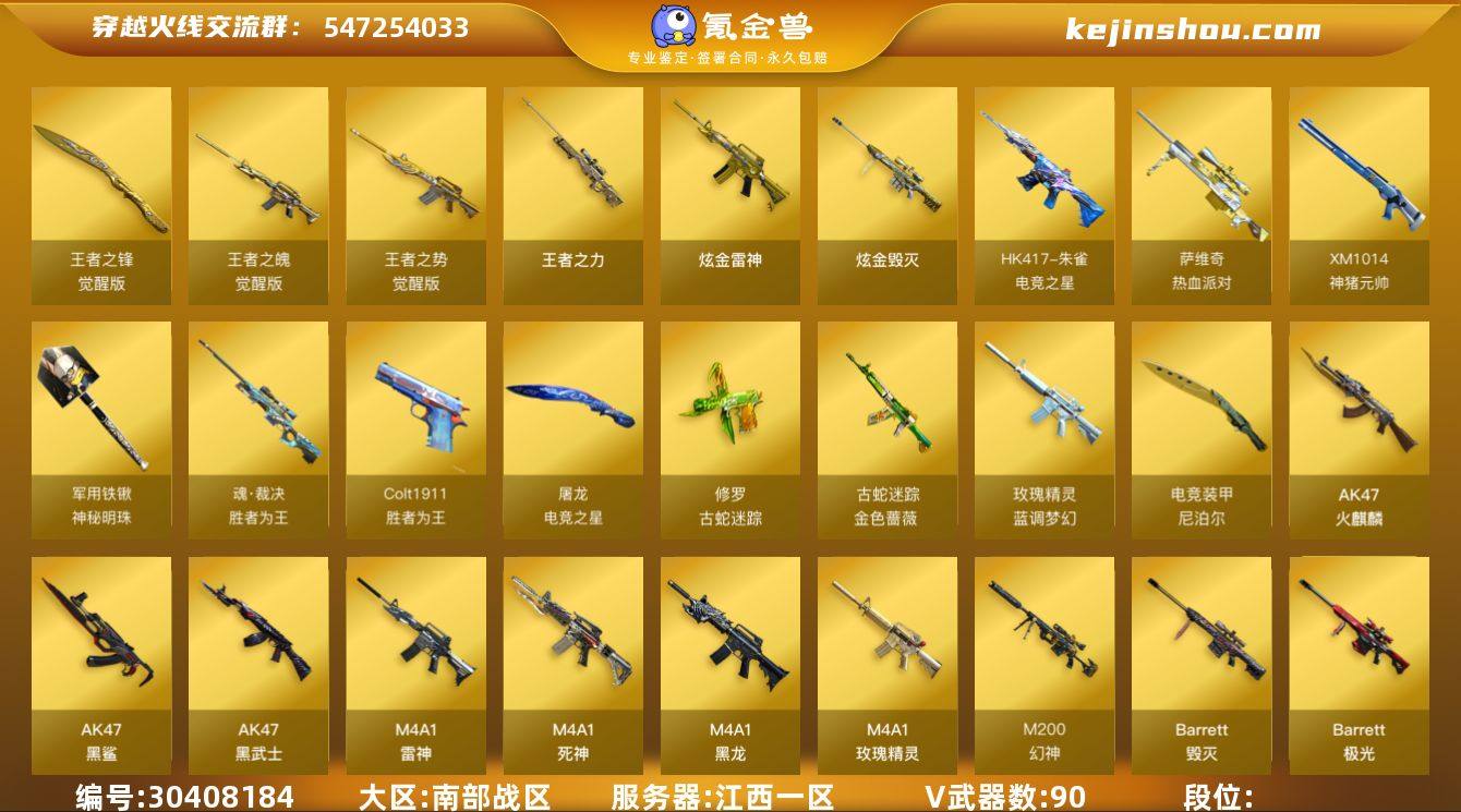 南部战区(江西一区)【精品生化爆破号】90v【幻神套装+五皮/荣耀世冠EP/冠军之幻/荣耀世冠白鲨/AG-CFPLS17冠军/Heartshot,kar98K-星神,电竞装甲套装,动感闪耀套装,古蛇迷踪套装,QBZ03-金色蔷薇+双皮/荣耀世冠EP/冠军之薇,ScarLight-白虎+双皮/AG-CFPLS20冠军/电玩粉兔,AWM-裁决+三皮/叶芒苍灵/胜者为王/运输船,HK417-朱雀-电竞之星+音效卡,6烈龙+斯泰尔-蝴蝶+炼狱-迷你小钢,柯尔特-冠军之特*3,Knife-冠军之刃,柯尔特-电竞之星+音效卡,柯尔特-电竞装甲,黄金猫猫手套-白鲨,胡萝卜匕首】4王者【王者之魄,王者之势,王者之力,王者之锋】4炫金【炫金武士,炫金雷神,炫金骑士,炫金毁灭】15角色【关小雨,王者-瞳-闭月羞花,王者炽天使,王者葵-翩若惊鸿,王者沙漠玫瑰,沙漠玫瑰,王者之瞳,葵,零,不败狙神,幻面灵狐,乔伊教练,蛇隐宗,修道士,云海玲珑】7音效【M200-幻神音效卡,HK417-朱雀-电竞之星-竞星悦动音效卡,M4A1-雷神音效卡,Barrett-毁灭音效卡,柯尔特-电竞之星-竞星悦动音效卡,屠龙-电竞之星-竞星悦动音效卡,绝迹语音包】52皮【幻神(荣耀世冠EP/冠军之幻/荣耀世冠白鲨/AG-CFPLS17冠军/Heartshot),QBZ03-荣耀世冠EP,QBZ03-冠军之薇,白虎-AG-CFPLS20冠军,白虎-电玩粉兔,裁决-叶芒苍灵,裁决-胜者为王,裁决-运输船,毁灭-Heartshot,火麒麟-Heartshot,屠龙-星耀,雷神-机甲刑天,炽芒蝶刃-巅峰荣耀,毁灭-巅峰荣耀,擎天-冠军之击,屠龙-巅峰荣耀,雷神-星空,玫瑰精灵-蓝调梦幻,毁灭-星空,毁灭-英雄计划,炼狱-星空,火麒麟-雷神,火麒麟-CF STAR,毁灭-冠军之怒,火麒麟-冠军之心,雷神-冠军之魄,龙啸-青青莓果,火麒麟-平天大圣】小人枪【炼狱-迷你小钢,HK417-朱雀-蛇隐宗,M4A1-雷神-精英刀锋,火麒麟-灵狐,M82A1-水枪-不败狙神,天龙-曼陀罗,街机小灰机】【V...