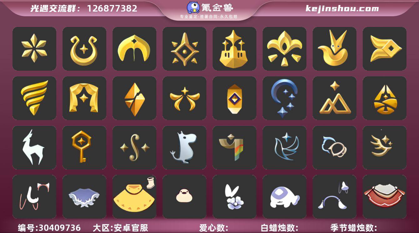 账号类型: 手机账号 季节已毕业: 音韵季,魔法季,圣岛季,预言季,梦想季,小王子季,风行季,潜海季,表演季,破晓季,欧若拉季,集结季,夜行季,追忆季,拾光季,归巢季,九色鹿季,筑巢季,二重奏季,姆明季,彩染季,青鸟季,双星季,迁徙季 完成地图: 晨岛,云野,雨林,霞谷,暮土,禁阁,全图毕业 珍稀物品: 阿努比斯(狗头),白枭,透明蝶翼斗,白鸟头,魔法季耳坠,玫瑰花 礼包: 蝙蝠套,巫师,围巾,星球斗,小狐狸,欧若拉之翼,音乐桌,绊爱,鹿角,蜘蛛斗,牛仔裤,兔子鞋,秋千,茶桌,茶壶,白绒金,瑞雪,女巫裙,福娃,小船,灯笼,奔跑裤子,致爱装扮,人声乐器,奔跑发型,鲤鱼套,彩虹帽,雪花球,绒帽,橘子,粽叶,贝壳,黄伞,兔子,南瓜,枯角,雪花,鲤鱼,tgc,水母,猫套,猫背饰,星月头饰,彩虹耳钉,彩虹耳机,奥利奥,海螺,四叶草,暗彩装扮,向日葵套,小提琴,拖鞋,爱心眼镜,火焰眼镜,创始人,飞鸟纸伞,彩虹泡泡机,日光耳环,遥鲲披肩斗篷,满月耳坠,月华套装,锦标赛短袍,锦标赛桂冠,线框斗,优雅三件套,姆明饰品套装,向日葵连衣裙,蛛网朋克,海龟斗篷,小狗周年发饰,篝火点心礼包,奉献斗篷,风之旅人白袍,必胜客联动分享披萨背饰礼包,青衫落拓礼包,周年影院套餐礼包,缤纷飘带斗篷礼包,小黄鸭雨衣套装礼包,小黄鸭发饰礼包,蝴蝶与花发饰礼包,暗陨斗篷礼包,小海牛配饰礼包,活力海牛礼包,皮皮猫套装礼包 裤子: 武士裤,背带裤,白棉裤,搓澡巾 面具: 黄鼠狼,红狐狸,阿努比斯 面饰: 魔法季耳坠,红耳机 项链: 围巾 发型: 蝴蝶结,正太,樱花,公主头,虚荣,猫耳,白鸟 头饰: 花环 斗篷: 白金,红金,白鸟斗,花瓣斗篷,荧蓝斗篷 配饰: 雨伞,排箫,高音钢琴,吉他,笛子,大铃铛乐器,乐器 亮点: 有迁徙季季卡