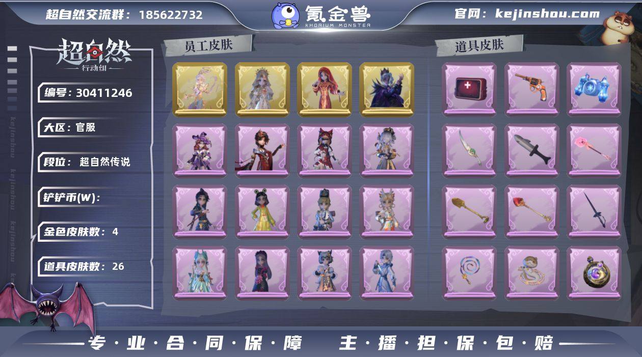金色皮肤数量:4 紫色皮肤数量:17 道具皮肤数量:26 莲华渡,圣光之谕,镜花辞,渡鸦公爵 卖家说:vva,小药,莉莉大情