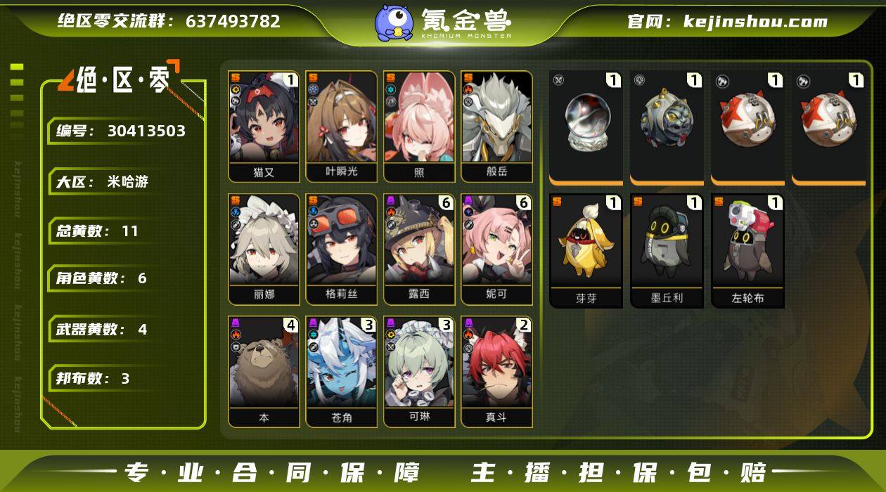 冒险等级:50 总黄数:11 菲林底片数量:0 菲林数量:195 加密母带数量:1 五星角色数:6 1命猫又,0命叶瞬光,0命照,0命般岳,0命丽娜,0命格莉丝 五星武器数:4 1精云霓孤光,1精怒目金刚,1精燃狱齿轮 邦布数量:3 1精芽芽,1精墨丘利,1精左轮布 卖家说:小光带皮