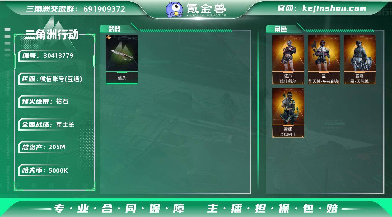 总资产:205M 哈夫币:5000K 烽火地带等级:60 烽火地带段位:钻石 全面战场段位:军士长 骇爪-维什戴尔,蛊-能天使·午夜邮差,露娜-黑·天际线 露娜-金牌射手 信条 卖家说:12颗心战绩可炫耀 顶级唐人号