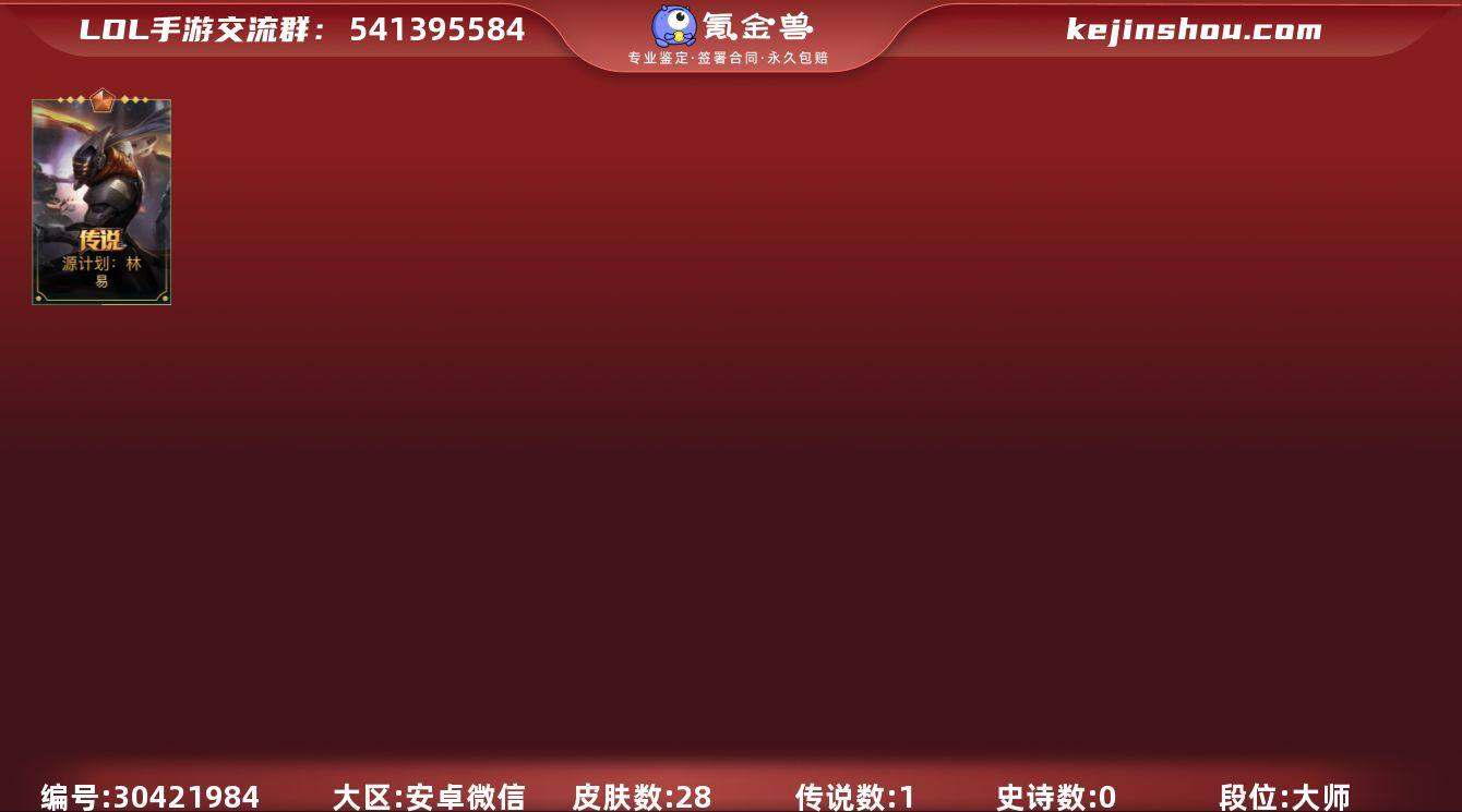 皮肤数:28 典藏皮肤数量:0 神话皮肤数量:0 传说皮肤数量:1 史诗皮肤数量:0 段位:大师 卖家说:三年以上微信号加游戏号