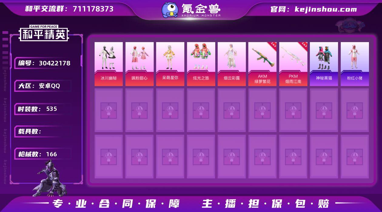 安卓Q-6粉装5特效枪7热门139套装166枪皮 50946热力值 9印记 历史卓越王牌9星 【6粉装】 金丰海韵 烟云彩露 炫光之旅 飒粉甜心 呆萌星弥 冰川幽秘 【5特效枪】 AKM-绿萝繁花 (5级) Kar98K-巳巳如意 (5级) DP-28-豹影疾电 (5级) PKM-江南烟雨 (7级) UMP45-量子极限 (5级) 【7热门】 龟仙人 神秘黑猫 暗夜契约 纯白誓言 粉红小猪 破蛋小黄鸡 极速红龙 【2飞行器】 梦幻火箭飞行器 天之羽翼飞行器 【1头盔】 梦幻火箭头盔 营地ID:902739976 PX_2330965
