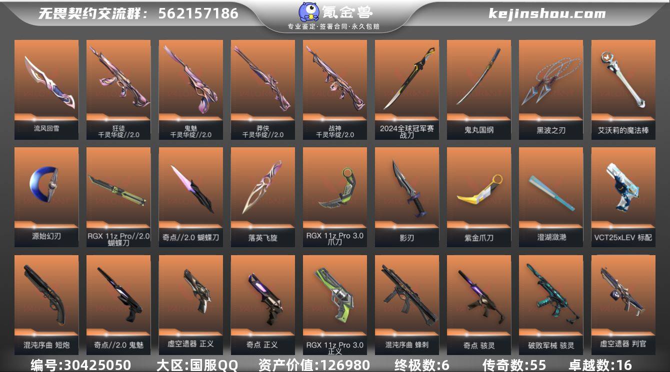 【自带包赔 可赔三倍】:库存价值126980 24冠军套装 千灵华绽//2.0 套装 当前白银 12w超大库存 性价比热门库存号 可包人脸 【限定】: 2024全球冠军赛 幻影, 2024全球冠军赛 战刀 【近战】: 流风回雪, 黑波之刃, 澄湖潋滟, RGX 11z Pro//2.0 蝴蝶刀, 紫金爪刀, 落英飞旋, 源始幻刃, 鬼丸国纲, 影刃, 奇点//2.0 蝴蝶刀, 2024全球冠军赛 战刀, RGX 11z Pro//3.0 爪刀, 艾沃莉的魔法棒 【狂徒】: 千灵华绽//2.0 狂徒, 多弥尔的复仇 狂徒, 洪荒怒焰 狂徒, 光荣异象 狂徒, 紫阙金琅 狂徒, 上古龙炎 狂徒, 创·纪元 狂徒, 虚空遗器 狂徒, 般若假面//2.0 狂徒, 掠影 狂徒, 奇点//2.0 狂徒, 混沌序曲 狂徒, 塑水宗 狂徒 【幻影】: 异鳞魔蛇 幻影, 砰砰X特攻队 幻影, 洪荒怒焰 幻影, 虚空遗器 幻影, 2024全球冠军赛 幻影, 千灵华绽 幻影 【冥驹】: 上古龙炎 冥驹, 偃月苍龙 冥驹, 千灵华绽 冥驹, 掠影 冥驹, 全息波普//2.0 冥驹 【正义】: 奇点 正义, 虚空遗器 正义, 掠影 正义, RGX 11z Pro//3.0 正义 【戍卫】: 天界神兵 戍卫, 掠影 戍卫 【獠犬】: 海洋之星//2.0 獠犬, 般若假面//2.0 獠犬 【鬼魅】: 千灵华绽//2.0 鬼魅, 天界神兵 鬼魅, 奇点//2.0 鬼魅, 艾沃莉的梦之翼 鬼魅 【骇灵】: 破败军械 骇灵, 奇点 骇灵 【标配】: VCT25 x LEV 标配, 紫阙金琅 标配 【短炮】: 混沌序曲 短炮 【狂怒】: 上古龙炎 狂怒, 般若假面//2.0 狂怒 【蜂刺】: 混沌序曲 蜂刺 【雄鹿】: 盖亚的复仇//2.0 雄鹿 【判官】: 上古龙炎 判官, 全息波普 判官, 虚空遗器 判官 【飞将】: 西部未来 飞将 【战神】: 千灵华绽//2.0 战神, 离子武器//2.0 战神, 般若假面//2.0 战神 【莽侠】: 千灵华绽//2.0 莽侠, 创·纪元 莽侠, RGX 11z Pro//3.0 莽侠 【概要】: 总皮肤 191 终极6 传奇 55 卓越16 英雄28 LV221 历史最高:铂金 当...