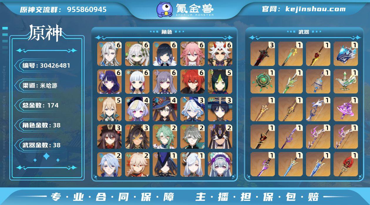 冒险等级:60 总黄数:174 男/女主:男主 5星角色数:38 5星武器数:38 纠缠之源数量:70 原石数量:114093 卖家说:自己打的,目前全部换成原石的话就还有860抽
