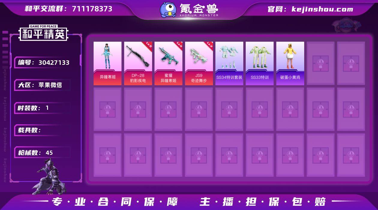 区服:苹果微信-服饰币:446-金币:13050-点券:2-当前热力值:13928-王牌次数:2-点券:2 时装:135 枪械:45 装备:61 载具:0 战备:28 4粉装-- 异瞳寒姬 DP-28-豹影疾电 JS9-奇迹舞步 蜜獾-异瞳寒姬 破蛋小黄鸡 S686-奇异狩猎者