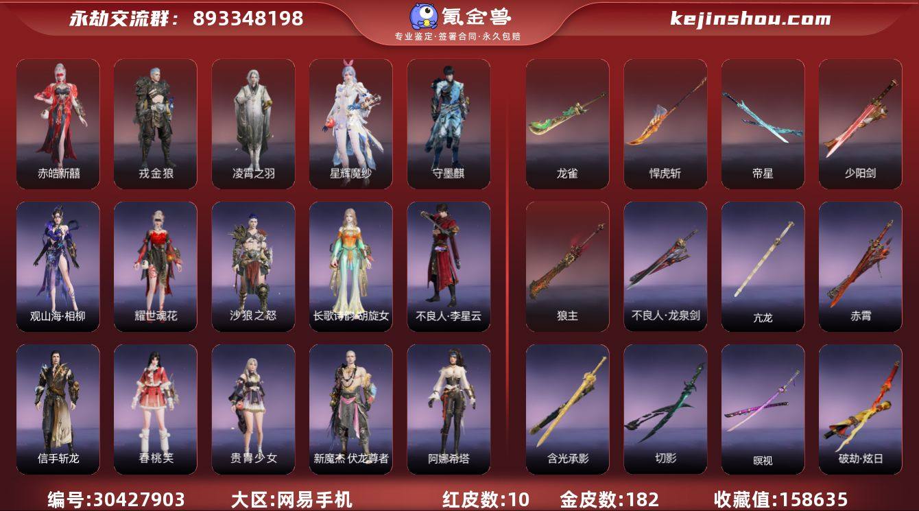 红皮数:10 黄皮数:182 收藏值:158635 幻丝数:64798 等级:152 三排段位:白银 通行证:未升级 赤皓新囍,戎金狼,凌霄之羽,星辉魔纱,守墨麒 龙雀,悍虎斩,帝星,少阳剑,狼主