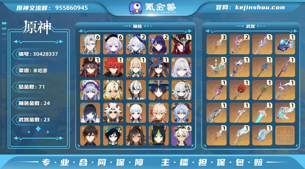 邮箱: 不送邮/死邮 总黄数: 71 冒险等级: 60 6命金色角色: 满命七七,满命那维莱特 2命金色角色: 二命雷电将军,二命芙宁娜 1命金色角色: 一命迪卢克,一命莫娜,一命琴,一命胡桃,一命恰斯卡 0命金色角色: 温迪,枫原万叶,神里绫华,钟离,甘雨,荒泷一斗,夜兰,提纳里,纳西妲,流浪者,迪希雅,阿蕾奇诺,希诺宁,梦见月瑞希,丝柯克 拥有武器: 天空之翼,雾切之回光,飞雷之弦振,四风原典,天空之卷,和璞鸢,阿莫斯之弓,天空之傲,风鹰剑,天空之脊,护摩之杖,薙草之稻光,终末嗟叹之诗,息灾,若水,千夜浮梦,万世流涌大典,苍耀 3精武器: 天空之脊 2精武器: 飞雷之弦振 1精武器: 天空之翼,雾切之回光,四风原典,天空之卷,和璞鸢,阿莫斯之弓,天空之傲,风鹰剑,天空之脊,护摩之杖,薙草之稻光,终末嗟叹之诗,息灾,若水,千夜浮梦,万世流涌大典,苍耀 亮点: 带280抽,平台合作商·7万保证金顶级信誉商家 【赠永久包赔找回真赔】q480