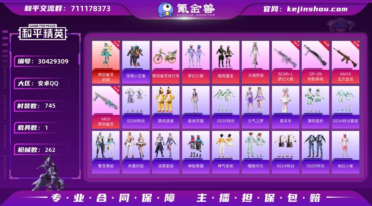 【1红3粉装4特效枪1载具梦幻火箭5级五爪金龙】 安卓Q区-83026热力值-14印记-189套装-262枪皮 【1红装】 辉羽雀灵-初翊(3级)【1载具】 辉羽雀灵自行车【3粉装】 梦幻火箭 暗夜鎏金 角色-冷漠罗丽【4特效枪】 SCAR-L-梦幻火箭(7级) DP-28-豹影疾电(5级) M416-五爪金龙(5级) MG3-辉羽雀灵(3级)【12热门】 雪山精英(老6服) 深海小丑鱼 极速红龙 豚鼠丹丹 团圆交子 神秘黑猫 MG3-乌木金纹 M249-妙红点点 Mini14-炫彩节奏 Kar98K-彩虹符号 M416-糯团青竹 AKM-彩虹符号【3飞行器】 黄族统领飞行器 伏魔团飞行器 雀灵庇佑飞行器【2背包】 甜心宝贝背包 心之恋语背包 营地ID:702176740