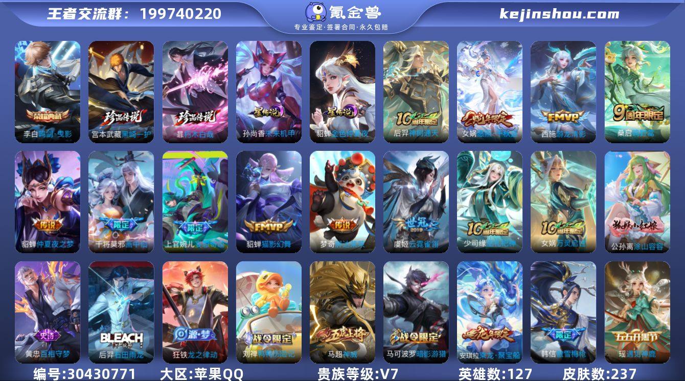 贵族等级:V7 典藏皮肤数:1 珍品无双皮肤数:0 无双皮肤数:0 珍品传说皮肤数:2 传说皮肤数:10 史诗皮肤数:75 皮肤数:237 英雄数:127 段位:荣耀王者
