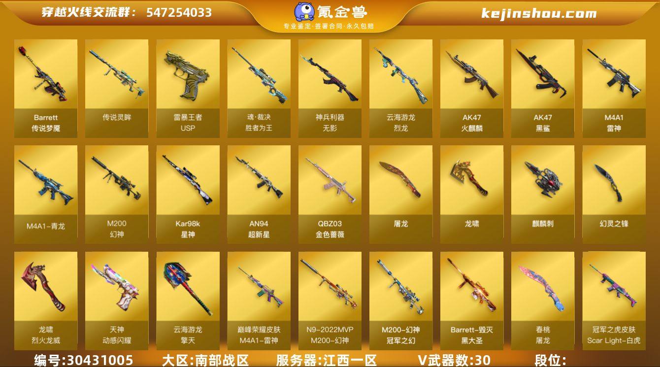 南部战区(江西一区)【精品纯爆破号】双传说【传说灵眸/传说梦魇】30v【M200-幻神+三皮/宠儿/N9/冠军之幻,Kar98K-星神,QBZ03-金色蔷薇,M4A1-青龙,USP-雷暴王者,Colt1911-大黄蜂】1王者【USP-雷暴王者】3角色【四防王者影豹,乔伊教练,云海玲珑】11皮【幻神-宠儿,幻神-N9,幻神-冠军之幻,雷神-巅峰荣耀,火麒麟-百城,火麒麟-CF STAR,屠龙-春桃,毁灭-黑大圣,黑骑士-伏羲,白虎-冠军之虎,雷神-荣耀之魄】截图展示段位不代表实际段位 如赛季更新等不可抗拒因素发生变化、时限道具不保证所剩时间