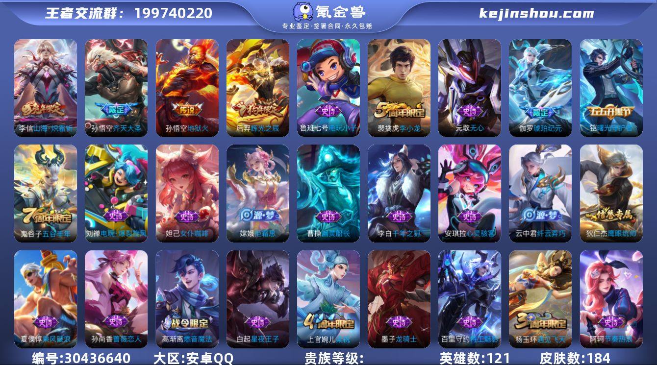 【4600】安卓Q-V4-永恒钻石II段位-126英雄-187皮肤-1典藏皮肤-8传说-44史诗 【英雄全皮】:孙权全皮 【荣耀典藏】:李白鸣剑曳影 【传说皮肤】:后羿神树通天,孙悟空齐天大圣,曜云鹰飞将,李信一念神魔,干将莫邪久胜战神,后羿黄金射手座,孙尚香末日机甲,宫本武藏地狱之眼 【限定皮肤】:蒙犽顽岩魄,姜子牙天穹之誓,狄仁杰阴阳师,赵云皇家上将,墨子神迹守卫,鲁班七号乒乒小将,庄周高山流水,高渐离玩趣恶龙,芈月白晶晶,元歌无心,马可波罗山海玄木吟,狄仁杰魔术师,达摩沙漠行僧,项羽海滩派对,老夫子航海奇遇记,兰陵王金庭之子,孙悟空至尊宝,孙悟空齐天大圣,后羿如梦令,李元芳云中旅人,钟馗驱傩正仪,苏烈千军破阵,百里玄策原初追逐者,沈梦溪大漠名商,裴擒虎李小龙,裴擒虎擒涛扼浪,上官婉儿梁祝,鲁班大师探海日志,桑启海盐诗旅,艾琳女武神,张良古海寻踪,蒙犽百解令,鬼谷子天穹祈灯,沈梦溪龙舞盛年,鲁班七号蔬乡物语,李元芳蔬乡物语,刘邦剑破天穹,周瑜熔金海岸 【年限皮肤】:马可波罗山海玄木吟 【赛季限定】:钟馗驱傩正仪,苏烈千军破阵,达摩沙漠行僧,兰陵王金庭之子,沈梦溪大漠名商,李元芳云中旅人,桑启海盐诗旅,裴擒虎擒涛扼浪,鲁班大师探海日志,张良古海寻踪,鬼谷子天穹祈灯,刘邦剑破天穹,姜子牙天穹之誓,东皇太一噬灭天穹,太乙真人谧流熔炉,甄姬逆浪荇歌,百里玄策原初追逐者,牛魔星界战将 【战令限定】:老夫子航海奇遇记,墨子神迹守卫,鲁班七号蔬乡物语,李元芳蔬乡物语 【史诗皮肤】:露娜紫霞仙子,阿轲暗夜猫娘,赵云皇家上将,甄姬冰雪圆舞曲,王昭君偶像歌手,狄仁杰魔术师,孙尚香水果甜心,妲己魅力维加斯,墨子金属风暴,吕布圣诞狂欢,李白千年之狐,张飞乱世虎臣,孙悟空至尊宝,花木兰水晶猎龙者,小乔缤纷独角兽,兰陵王暗隐猎兽者,...