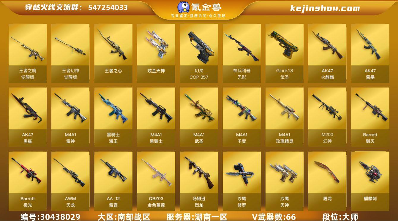 湖南一区-68V-3王者-1炫金 【热门武器】:QBZ03-金色蔷薇,M200-幻神,M4A1-黑骑士,汤姆逊-烈龙*7,斯泰尔-蝴蝶,COP-白鲨,USP-雷暴,COP 357-幻灵,沙鹰-修罗*3,Knife-冠军之刃,黄金猫猫手套-白鲨 【王者炫金武器】:王者之心,炫金天神 【音效卡】:烈龙-云海游龙音效卡,AK47-火麒麟音效卡*2,M4A1-雷神音效卡,Barrett-毁灭音效卡 【皮肤】:幻神-冠军之幻,M200-幻神-荣耀世冠白鲨,QBZ03-荣耀世冠白鲨,雷神-传奇N9,雷神-R.LGD-CFPLS18冠军,M4A1-雷神-新春神龙皮肤,火麒麟-平天大圣,火麒麟-巅峰荣耀,火麒麟-心动糖果,毁灭-冠军之怒,战神-粉色甜心皮肤,战神-流金岁月皮肤,AK47-B-常胜将军-刘备,AWM-天龙-传奇70KG 【角色】:迷迭香,隼,王者影豹,乔伊教练,云海玲珑,暗夜-X,嘉年华灵狐,娟娟,猎狐者-追月,零-水下丽影,曼陀罗-X,潘多拉-X,潜龙队-X,邱刚敖,青霞仙子,斯沃特-X,铁骑荣耀,雪莉杨 【人偶武器】:COP-白鲨,M4A1-雷神-精英刀锋*2,斯泰尔-蝴蝶,AWM-灵狐-15周年嘉年华,迷你深渊冰龙*2,迷你波特博士*3,迷你火种*3,迷你超能女侍 【暴走生化】:超级对讲机 【挑战大师】:神圣爆裂者III,AK47-冰龙粉碎者,冰龙粉碎者-白马银枪 【英雄级武器】:M4A1-千变,AK47-火麒麟*3,M4A1-雷神,M4A1-黑骑士,M4A1-武圣,AK47-黑鲨,AK47-雷暴,无影-神兵利器,M4A1-玫瑰精灵*2,QBZ03-金色蔷薇,烈火-动感闪耀,王者之魄-觉醒版,黑骑士-海王,AWM-天龙,Barrett-毁灭*2,Barrett-极光,M200-幻神,Barrett-金色蔷薇*2,王者幻神-觉醒版,汤姆逊-烈龙*7,AA-12-雷霆,沙鹰-修罗*3,沙鹰-天神,USP-雷暴,COP 357-幻灵,Glock18-武圣,天神-动感闪耀,修罗-云海游龙*2,屠龙*2,麒麟刺*2,屠龙-动感闪耀,斩神刀-雷暴,高爆手雷-雷暴*5,高爆手雷-幻灵,手雷-动感闪耀,手雷-云...