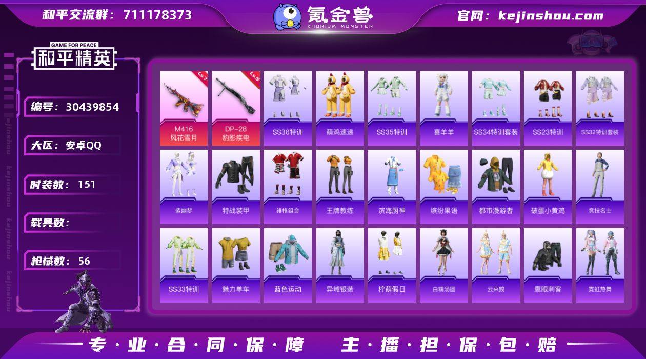 热力值:16769 时装数:151 枪械数:56 战备数:48 游戏等级:45 卓越印记:0 传奇印记:0 绝世印记:0 七级M416-风花雪月,五级DP-28-豹影疾电 绝对恒星降落伞,异瞳寒姬降落伞,绯果甜心飞行器,时光之誓飞行器,智耀战神降落伞 SS36特训,萌鸡速递,SS35特训,喜羊羊,SS34特训套装,缤纷果语,滨海厨神,白糯汤圆,白色伏地魔,长空猛禽,顶瓜瓜,大橘大利,都市漫游者,绯格组合,疯狂小兔子,粉恋花,竞技名士,蓝冰羽,蓝调潮人,蓝色运动,猎影月神,魅力单车,霓虹热舞,柠萌假日,破蛋小黄鸡,青涩时光,云朵鹅,SS22特训,SS23特训,SS32特训套装,SS33特训套装,特战装甲,王牌教练,雪绒豹,鹰眼刺客,异域银装,紫幽梦 MK12-乌木金纹,UZI-炫彩糖果,AKM-霓彩脉冲,Famas-霓彩脉冲,SLR-霓彩脉冲,破片手榴弹-拽到爆炸,S12K-霓彩脉冲,AKM-破晓战魂,AUG-耀粉歌者,短管霰弹-星穹咏叹调,大砍刀-云朵鹅,DP-28-彩虹符号,Kar98K-星穹咏叹调,M249-糯团青竹,M24-时光之吻,M416-糯团青竹,M417-玩趣呆呆,M762-天降萌叽,M762-云朵鹅,Mini14-耀粉歌者,Mini14-炫彩节奏,Mk14-紫幽梦,MK20-H-狂鲨锋刃,P92-紫幽梦,平底锅-紫幽梦,PKM-紫幽梦,R45-幻彩电音,S12K-夜灯,S1897-糯团青竹,S1897-紫幽梦,SCAR-L-红色方程式,SCAR-L-炫彩节奏,SLR-彩虹符号,沙漠之鹰-云朵鹅,SPAS-12-狂鲨锋刃,SPAS-12-云朵鹅,SVD-云朵鹅,UMP45-蓝色火焰,UZI-啾咪啾咪 SS36王牌降落伞,异域银装飞行器,SS35王牌降落伞,鸡智如我飞行器,SS34王牌降落伞,云朵鹅降落伞,紫幽梦降落伞 实名:不可二次实名