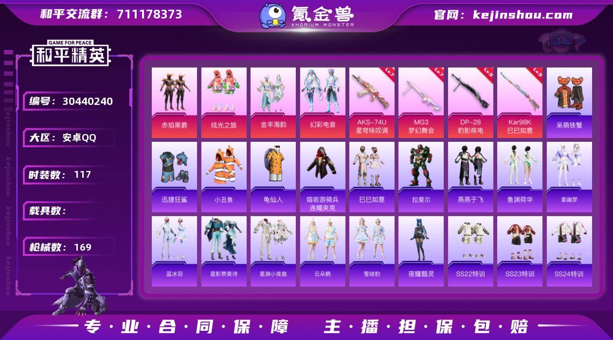 安卓 【小号 小丑鱼 熔岩游骑兵连帽夹克 赤焰黑爵 炫光之旅 金丰海韵 幻彩电音 AKS-74U-星穹咏叹调(七级)】手Q-4粉装-4特效枪-0载具-0粉色飞行器-48121热力值-12王牌印记-117套装-169枪皮 【热门品类】:套装-小丑鱼,套装-龟仙人,熔岩游骑兵连帽夹克 【粉色套装】:粉装-赤焰黑爵,粉装-炫光之旅,粉装-金丰海韵,粉装-幻彩电音 【粉色枪皮等级】:AKS-74U-星穹咏叹调(七级),Kar98K-巳巳如意(五级),DP-28-豹影疾电(五级),MG3-梦幻舞会(七级) 【粉色枪皮】:AKS-74U-星穹咏叹调,Kar98K-巳巳如意,DP-28-豹影疾电,MG3-梦幻舞会 【粉色降落伞】:未来战士降落伞,旋转彩虹降落伞,音爆索尼克降落伞,粉樱探戈降落伞,炫光之旅降落伞,繁龙极客降落伞,鬼刀降落伞,星穹咏叹调降落伞,冷漠罗丽降落伞,荧海星豚降落伞,绯穹魔姬降落伞,异瞳寒姬降落伞 【稀有套装】:套装-龟仙人,套装-巳巳如意,套装-雪国风尚,角色-拉斐尔,套装-燕燕于飞,套装-鱼渊荷华,套装-紫幽梦,套装-蓝冰羽,套装-星影赞美诗,套装-星渊小夜曲,套装-云朵鹅,套装-雪绒豹,角色-夜瞳黯灵 【稀有枪皮】:AUG-冰晶雪宝,AKM-奇异狩猎者,AKM-彩虹符号,AKM-破晓战魂,AKM-龙的传人,M16A4-幻世战舞者,M16A4-红色方程式,M16A4-蓝色火焰,M16A4-雨林猎影,SCAR-L-夜灯,SCAR-L-未来战士,SCAR-L-炫彩节奏,SCAR-L-玉兔迎春,SCAR-L-红色方程式,M416-暗夜行者,M416-糯团青竹,M416-红色方程式,M416-蓝色火焰,GROZA-懵萌河马,GROZA-田园牧歌,AUG-天降萌叽,AUG-耀粉歌者,M762-天降萌叽,M762-深海曼妙,M762-第五大道,M762-绯红前夜,M762-云朵鹅,Mk47-妙红点点,Mk47-炫光之旅,G36C-冷魅冰骑,G36C-懵萌河马,G36C-星穹咏叹调,AC-VAL-天降萌叽,蜜獾-天降萌叽,UZI-啾咪啾咪,UZI-红色方程式,UMP45-夜灯,UMP45-涂山之恋...