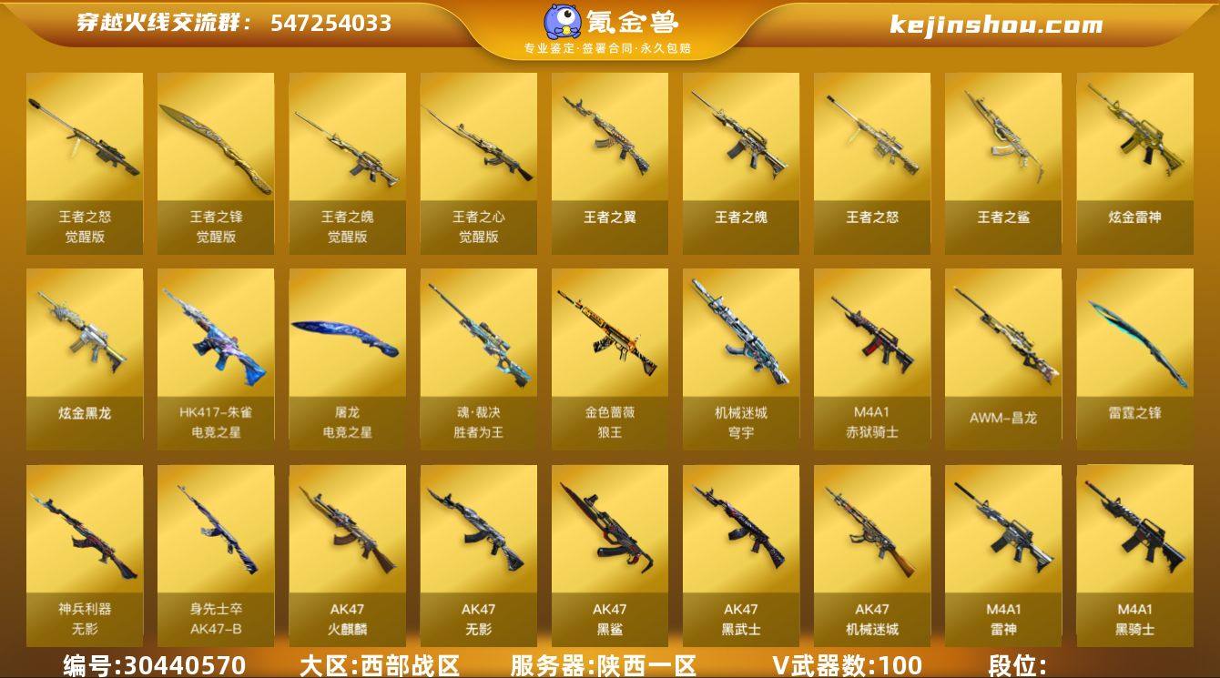 西部战区(陕西一区)【生化爆破号】100v【M200-幻神+皮/降龙,ScarLight-白虎,QBZ03-金色蔷薇,HK417-朱雀-电竞之星,AWM-裁决,6盘龙+6烈龙+6修罗+死亡之眼,Colt1911-大黄蜂】10王者【王者之心,王者之翼,王者之鲨,王者之魄,王者之怒,王者之锋】5炫金【炫金黑龙,炫金雷神,炫金骑士】10角色【葵,零·纪元,战地猎狐,幻面灵狐,乔伊教练,四防王者-葵-貂蝉,王者-瞳-闭月羞花,王者复仇,修道士,云海玲珑】3音效【HK417-朱雀-电竞之星-竞星跃动音效卡,AWM-昌龙-怀旧音效卡,屠龙-电竞之星-竞星跃动音效卡】50皮【幻神-降龙,修罗-耀金,雷神-耀金,无影-耀金,天龙-传奇白鲨,火麒麟-AG战队,雷神-荣耀之魄,火麒麟-CFSTAR】小人物枪【M82A1-水枪-不败狙神,天龙-曼陀罗】VIP6截图展示段位不代表实际段位 如赛季更新等不可抗拒因素发生变化、时限道具不保证所剩时间
