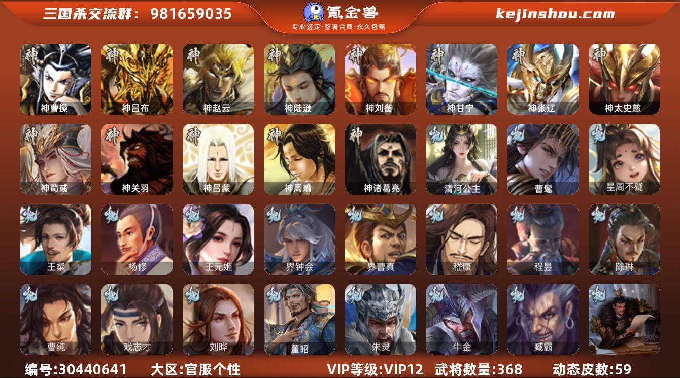 VIP等级: VIP12 官阶: 大将军 武将数量: 368 动态皮肤数量: 59 神将: 神曹操,神甘宁,神刘备,神陆逊,神吕布,神太史慈,神荀彧,神张辽,神赵云,神关羽,神吕蒙,神周瑜,神诸葛亮 魏国武将: 刘晔,戏志才,曹纯,陈琳,程昱,嵇康,界曹真,界钟会,王元姬,杨修,王粲,唐咨-魏,徐庶,张辽,SP蔡文姬,SP关羽,SP贾诩,SP姜维,SP庞德,卞夫人,蔡贞姬,曹昂,曹操,曹冲,曹洪,曹丕,曹仁,曹叡,贾逵,王异,张恭,鲁芝,曹休,界曹植,满宠,荀攸,王基,钟繇,蒯越蒯良,郭嘉,牵招,荀彧,阮慧,杜畿,界郭嘉,崔琰,界曹丕,界荀彧,朱灵,界甄姬,吕虔,界王异,界许褚,界郭淮,华歆,陈群,界典韦,谋甄姬,袁涣,李通,乐进,郭淮,界曹彰,郭皇后,毌丘俭,夏侯惇,曹植,司马朗,谋于禁,界曹操,星周不疑,许褚,界张辽,谋徐晃,张郃,钟会,文聘,曹彰,界夏侯惇,诸葛诞,司马懿,甄姬,杨阜,徐晃,孙资刘放,韩浩史涣,胡班,曹真,典韦,界夏侯渊,夏侯渊,李典,于禁,王双,邓艾,界司马懿,张春华,孟达-魏,臧霸,牛金,朱灵(国战),曹髦,清河公主,董昭 蜀国武将: 董允,关索,花鬘,谯周,沙摩柯,王平,张星彩,赵襄,诸葛瞻,谋马超,谋赵云,马云騄,徐庶,界魏延,杨仪,界关羽,邓芝,界伊籍,胡金定,费祎,界黄月英,赵云,张松,彭羕,李丰,界刘备,谋姜维,刘封,糜竺,谋庞统,黄月英,刘巴,关羽,吴懿,祝融,张飞,黄皓,魏延,界周仓,马忠,界法正,糜夫人,刘禅,界赵云,谋诸葛亮,张翼,关银屏,SP孙尚香,SP徐庶,卧龙诸葛,宗预,周仓,简雍,界关兴张苞,诸葛亮,界张飞,界卧龙诸葛,法正,赵统赵广,界马岱,关平,马岱,界庞统,庞统,诸葛果,谋张飞,马谡,马超,霍峻,廖化,关兴张苞,谋关羽,孟获,夏侯氏,姜维,黄忠,刘备,界马超,李严,马良,傅肜,蒋琬费祎,刘谌,蜀-孟达,彭羕(国战),甘夫人,势陈到 吴国武将: 贺齐,界徐盛,留赞,骆统,孙皓,潘濬,周泰,全琮,吕蒙,诸葛恪,界孙尚香,界顾雍,大乔小乔,桥公,谋周瑜,许贡,丁奉,谋吕蒙,界全琮,孙茹,蒋钦,顾雍,...