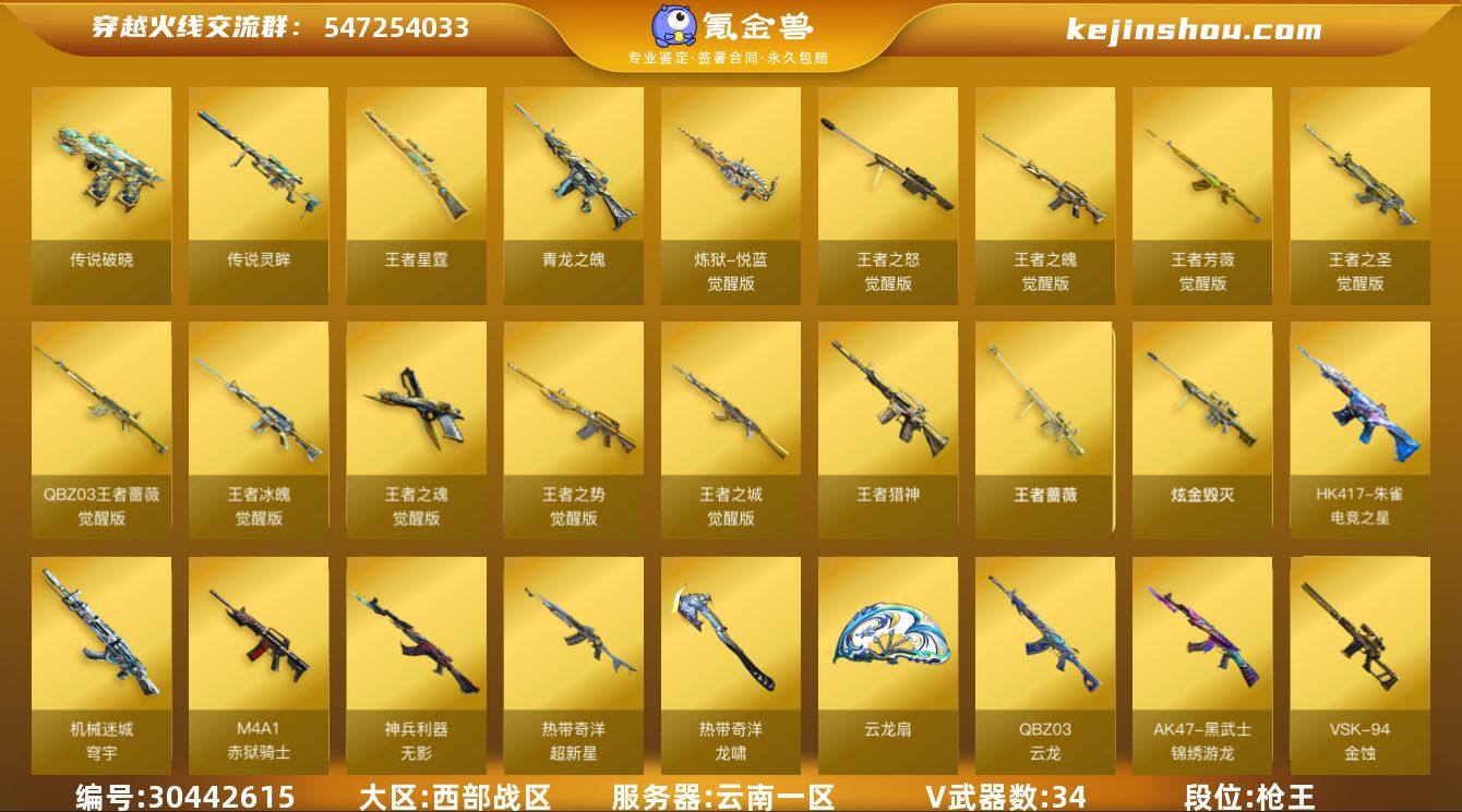 段位:枪王 V武器数:34 王者武器数:14 炫金武器数:1 传说灵眸,传说破晓 王者星霆,青龙之魄,炼狱-悦蓝-觉醒版,王者之怒-觉醒版,王者之魄-觉醒版,王者芳薇-觉醒版,王者之圣-觉醒版,QBZ-03-王者蔷薇-觉醒版,王者冰魄-觉醒版,王者之魂-觉醒版,王者之势-觉醒版,王者之城-觉醒版,王者猎神,王者蔷薇 炫金毁灭 HK417-朱雀-电竞之星,机械迷城-穹宇,M4A1-赤狱骑士,无影-神兵利器,超新星-热带奇洋,龙啸-热带奇洋,云龙扇,QBZ03-云龙,AK47-黑武士-锦绣游龙,VSK-94-金蚀,AK47-火麒麟,AK47-黑武士,M4A1-雷神,M4A1-黑骑士,M4A1-死神,M4A1-黑龙,M4A1-青龙,M4A1-千变,M4A1-猎神,白虎-电玩蓝兔,M200-幻神,Barrett-毁灭,Barrett-极光,AA-12-雷霆,AK12-天启,AN94-超新星,9A91-烈火,屠龙,麒麟刺,擎天,AK47-B-战神,AK-47-猩红传说,裁决,天神,擎天-云海游龙 王者-零-国色天香,王者-零-华冠丽服,王者-魅影,王者潘多拉 华,机械姬,灵动武士,零,战地猎狐 M200-幻神音效卡,M4A1-黑骑士音效卡,Barrett-极光音效卡,Barrett-毁灭音效卡,M4A1-雷神音效卡,AK47-火麒麟音效卡