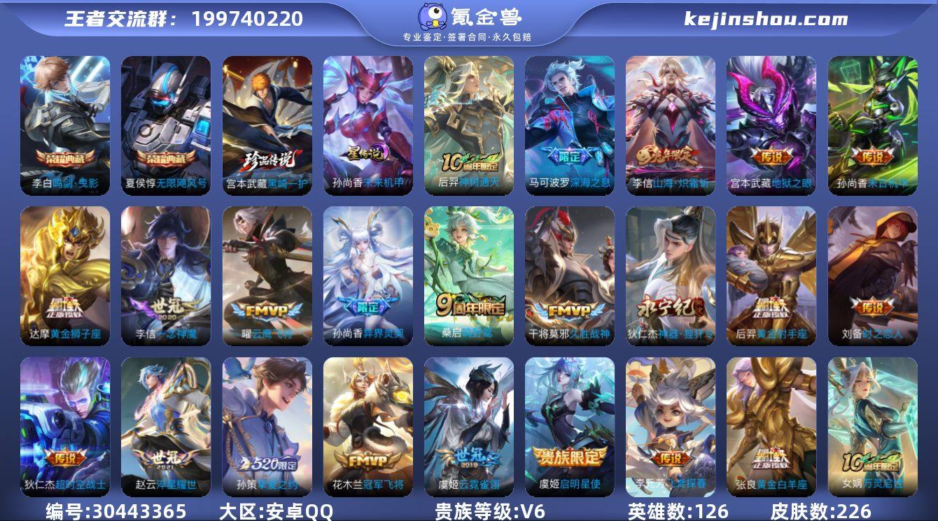 贵族等级:V6 典藏皮肤数:2 珍品无双皮肤数:0 无双皮肤数:0 珍品传说皮肤数:1 传说皮肤数:22 史诗皮肤数:71 皮肤数:226 英雄数:126 段位:王者 卖家说:43段射手号 万战李元芳便宜出,价格绝对合适