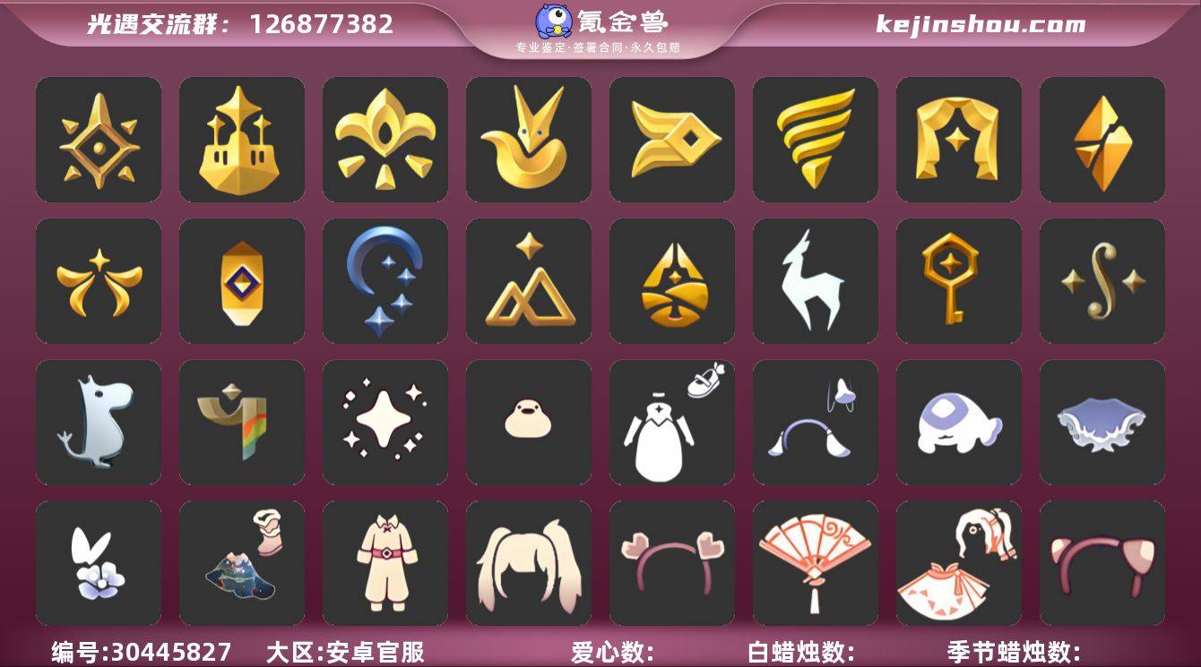 账号类型: 手机账号 季节已毕业: 预言季,梦想季,小王子季,风行季,潜海季,表演季,破晓季,欧若拉季,集结季,夜行季,追忆季,拾光季,归巢季,九色鹿季,筑巢季,二重奏季,姆明季,彩染季 完成地图: 晨岛,云野,雨林,霞谷,暮土,禁阁,全图毕业 珍稀物品: 阿努比斯(狗头),白枭,透明蝶翼斗,玫瑰花 礼包: 蝙蝠套,巫师,围巾,星球斗,小狐狸,绊爱,鹿角,荷叶伞,蜘蛛斗,兔子鞋,运动鞋,秋千,茶桌,茶壶,餐桌,白绒金,瑞雪,福娃,跷跷板,小船,人声乐器,鲤鱼套,橘子,粽叶,贝壳,黄伞,兔子,南瓜,枯角,鲤鱼,tgc,星月头饰,蝴蝶结,魔法棒,奥利奥,海螺,四叶草,浪漫流星斗,创始人,海蓝波浪发型,满月耳坠,月华套装,优雅三件套,向日葵连衣裙,海龟斗篷,园丁装扮,衔福献瑞礼包,献瑞折扇礼包,渐变双马尾发型礼包,心心相印发饰礼包,小狗周年发饰,宝藏猎人礼包,潮汐套装礼包,粽子发饰礼包,小黄鸭发饰礼包,蝴蝶与花发饰礼包,暗陨斗篷礼包,小海牛配饰礼包,活力海牛礼包,周年礼包,记忆水晶礼包 裤子: 武士裤,背带裤,白棉裤,搓澡巾 面具: 黄鼠狼,红狐狸,阿努比斯 面饰: 红耳机 项链: 围巾 发型: 蝴蝶结,正太,樱花,公主头,虚荣,猫耳 头饰: 花环 斗篷: 白金,红金,白鸟斗,花瓣斗篷,荧蓝斗篷 配饰: 雨伞,排箫,高音钢琴,吉他,笛子,大铃铛乐器,乐器 亮点: 重塑药水53,有迁徙季季卡