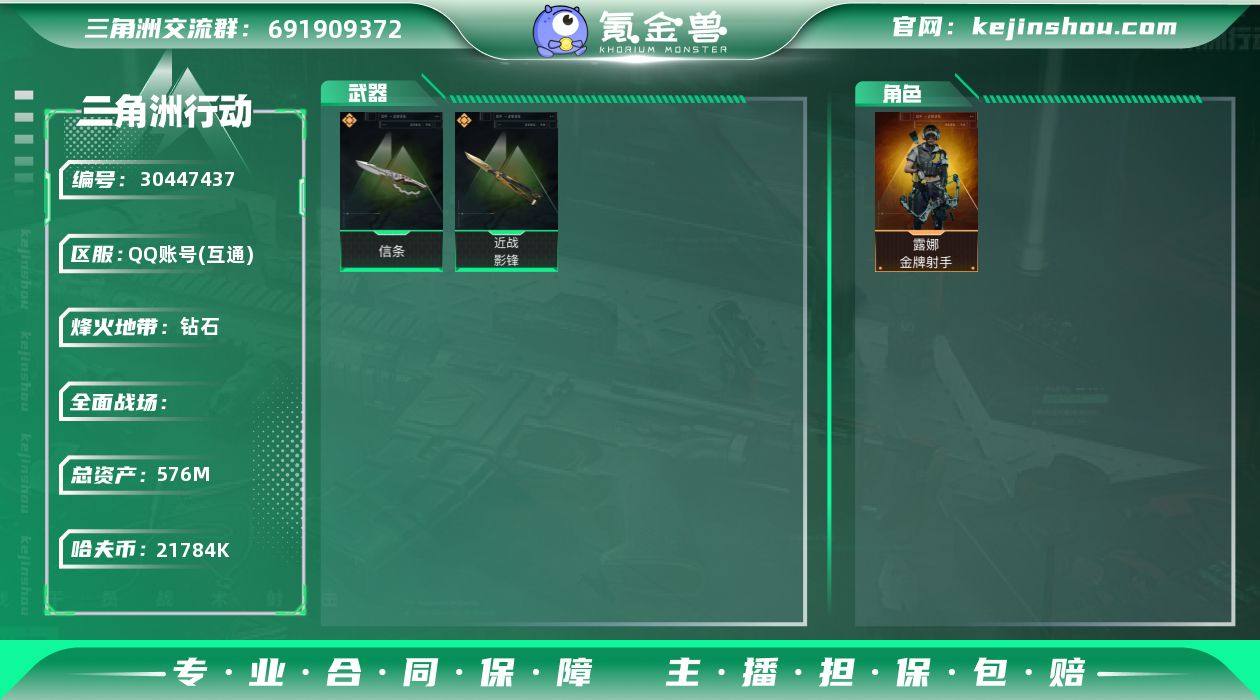 总资产:576M 哈夫币:21784K 烽火地带等级:60 烽火地带段位:钻石 露娜-金牌射手 信条,影锋 卖家说:很多刘涛 咖啡豆 其他皮肤也有蛮多 懒得截图了 m7的小柴什么的 红狼电锯惊魂 无名的夜鹰 风衣的无题密令 深蓝的不破誓约