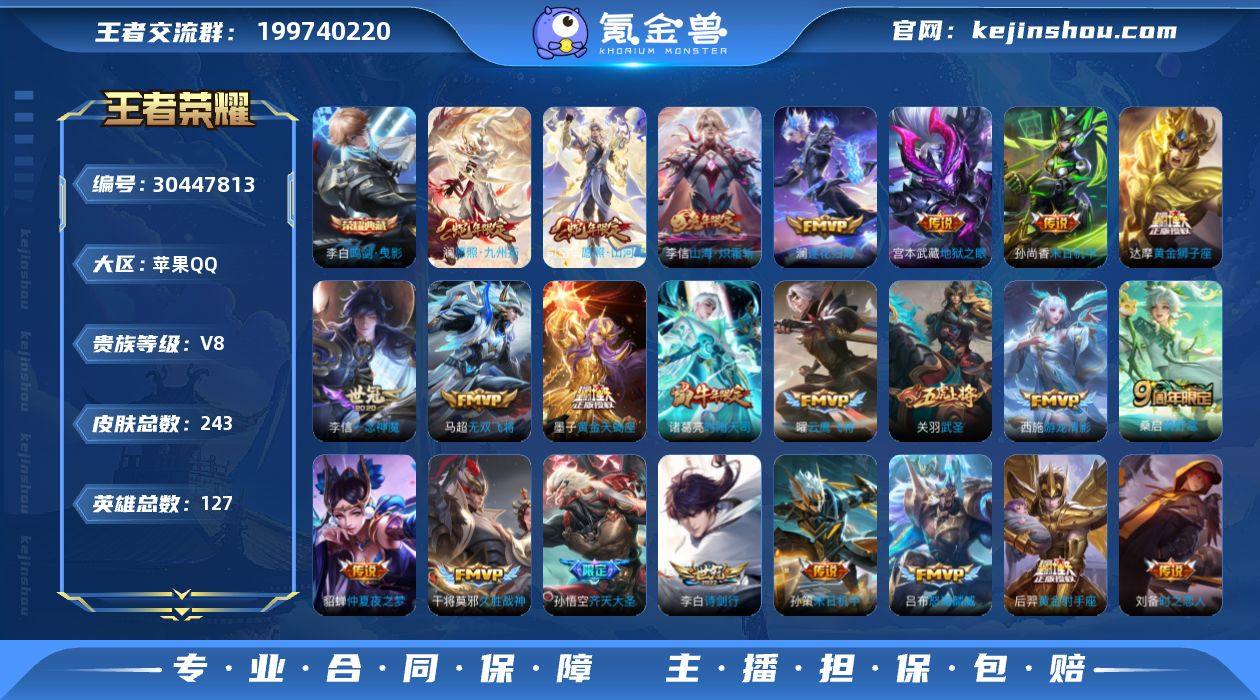 贵族8/皮肤243/典藏1/传说31/史诗67/英雄127/李信全皮/澜全皮/海诺全皮/鸣剑·曳影/愿照·山河定/愿照·九州拓/鸣野蒿/黄金天蝎座/澜逐花归海/妄想实况/电玩·雷克斯/画中仙/齐天大圣/山海·炽霜斩/怒海麟威/诗剑行/碎云/无双飞将/末日机甲-孙策/淬星耀世/游龙清影/时雨天司/启明星使/武圣/云鹰飞将/一念神魔/时之恋人-刘备/黄金白羊座/久胜战神/黄金狮子座/胖达荣荣/黄金射手座/仲夏夜之梦/末日机甲-孙尚香/地狱之眼/埋骨钱/蔡文姬夏日便利店/虞姬夏日便利店/天穹之誓(s36)/谪仙醉月/阴阳师/皇家上将/百木心枪/玩趣恶龙/幻夜卜梦/赤莲之焰/无心/山海·玄木吟/魔术师/沙漠行僧(s26)/海滩派对/午后时光/金庭之子(s27)/至尊宝/孙行者/云中旅人(s29)/五谷丰年/火炮绅士/青龙志/原初追遂者/星空之诺/大漠名商(s28)/擒涛扼浪(s31)/电玩高手/西部大镖客-猪八戒/暖冬·兔眠/探海日志(s32)/海盐诗旅(s30)/星界游侠/妲己灵卜魔法/鬼谷子天穹祈灯(S34)/龙武盛年/蔬乡物语(鲁班七号)/蔬乡物语(李元芳)/剑破天穹(s35)/程咬金群星魔术团/决胜骁骑/青焰无极/苍威无极/海诺心动手记/熔金海岸/未来纪元-赵云/圣诞恋歌/冰雪圆舞曲/偶像歌手/地狱岩魂/鬼剑武藏/水果甜心/摇滚巨星/魅力维加斯/圣诞狂欢/幽灵船长/千年之狐/末日机甲-吕布/乱世虎臣/白龙吟/水晶猎龙者/德古拉伯爵/乘风破浪/暗隐猎兽者/黄金分割率/心灵战警/冰冠公主/特工魅影/曙光守护者/天才门将/逐浪之夏/功夫厨神/星夜王子/节奏热浪/猫狗日记-孙策/鹰眼统帅/时之恋人-孙尚香/龙鼓争鸣/天秀·启明/乐园奇幻夜/暗渊魔法/永昼/赏金猎手/雪夜绮愿(周瑜)/怒海争锋/撼地雄心/破空之剑/百相守梦-百里守约/星界战将/茶境仙/鸭鸭历险记-刘禅/龙之律动/街头霸王/哥特玫瑰/爱心护理/大发明家/白执事/忍·炎影/红桃皇后/白色死神/西部大镖客(牛魔)/化身博士/未来纪元-宫本武藏/黄金武士/死...
