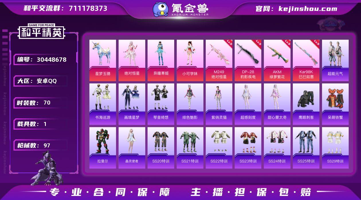 安卓 手Q-3粉装-5特效枪-1载具-2粉色飞行器-29838热力值-3王牌印记-70套装-97枪皮 【粉色套装】:角色-绝对恒星,角色-小可学妹,角色-异瞳寒姬 【粉色枪皮等级】:AKM-绿萝繁花(五级),AKS-74U-森灵之息(四级),Kar98K-巳巳如意(五级),M249-绝对恒星(七级),DP-28-豹影疾电(五级) 【粉色载具】:星梦玉骢 【粉色枪皮】:AKM-绿萝繁花,AKS-74U-森灵之息,Kar98K-巳巳如意,M249-绝对恒星,DP-28-豹影疾电 【粉色飞行器】:绝对恒星飞行器 【粉色降落伞】:绝对恒星降落伞,白勺歌姬降落伞,炎氏战神降落伞,星梦奇缘降落伞,忍者神龟降落伞,临安公主降落伞,冷漠罗丽降落伞,异瞳寒姬降落伞,炫彩糖果降落伞 【稀有套装】:套装-超能元气,角色-超感刻度,角色-甜心蒙太奇,套装-雪国风尚,角色-拉斐尔,套装-晶灵使者,角色-绯色魅影,角色-紫俏灵猫,套装-书海巡游,套装-画境星梦,套装-琴音绮想,套装-炫彩糖果 【稀有枪皮】:AUG-冰晶雪宝,AKM-破晓战魂,AKM-缤纷海域,AKM-龙的传人,M16A4-幻世战舞者,SCAR-L-是爱神辣,SCAR-L-炫彩节奏,SCAR-L-玉兔迎春,M416-糯团青竹,M416-绯红前夜,M416-蓝色火焰,GROZA-彩虹符号,GROZA-田园牧歌,AUG-天降萌叽,AUG-绝对恒星,M762-天降萌叽,M762-绯红前夜,Mk47-炫光之旅,蜜獾-天降萌叽,ACE32-画境星梦,UZI-啾咪啾咪,Vector-生命誓言,Vector-田园牧歌,汤姆逊-天降萌叽,MP5K-画境星梦,P90-倾城蜜语,Kar98K-星穹咏叹调,M24-影袭,SKS-夜灯,SKS-炫彩节奏,VSS-田园牧歌,VSS-绿野极光,Mini14-炫彩节奏,AMR-白勺歌姬,M417-惊鸿侠骨,M200-仲夏莫吉托,M200-惊鸿侠骨,M1加兰德-画境星梦,S686-奇异狩猎者,S686-未来战士,S686-生命誓言,S686-白勺歌姬,S1897-炫彩节奏,S1897-百万伏特,S12K-幻世战舞者,S12K-极意拳锋,AA12-G-画境星梦,SPAS...